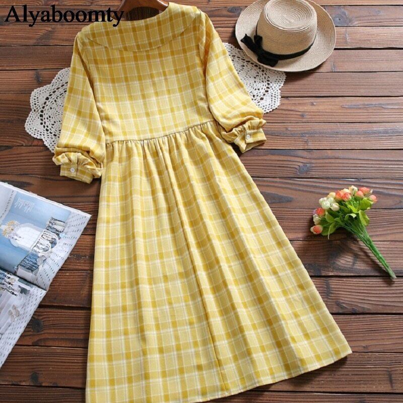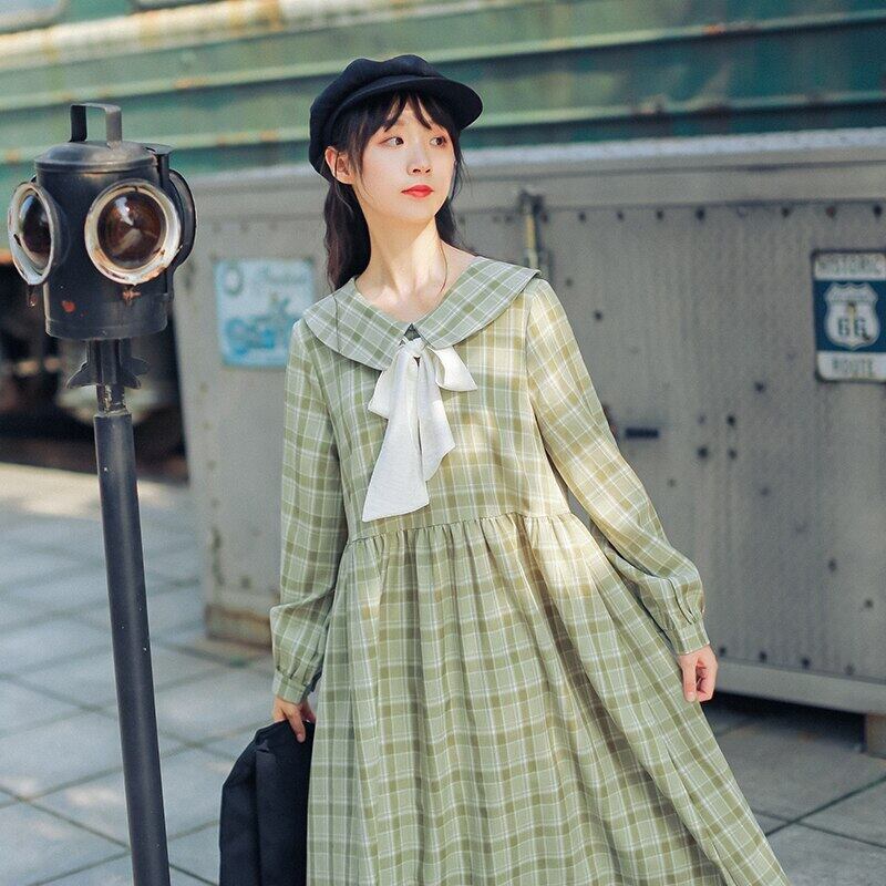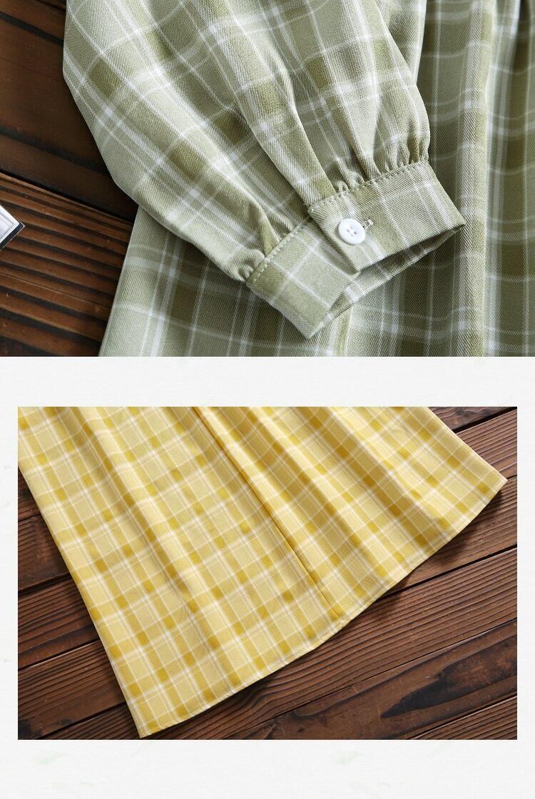 送料無料୨♥୧ ese森ミディレディースドレス イエローグリーン格子柄ルーズベスティドスオータムスプリングプレッピースタイルシックリボンドレス ワンピース AOS89715574040