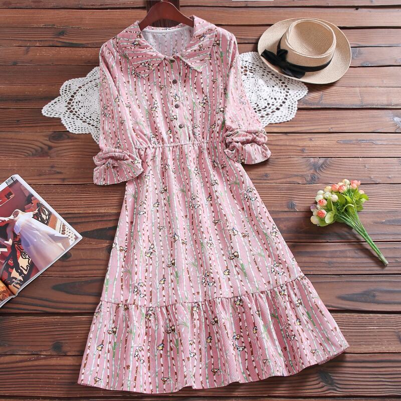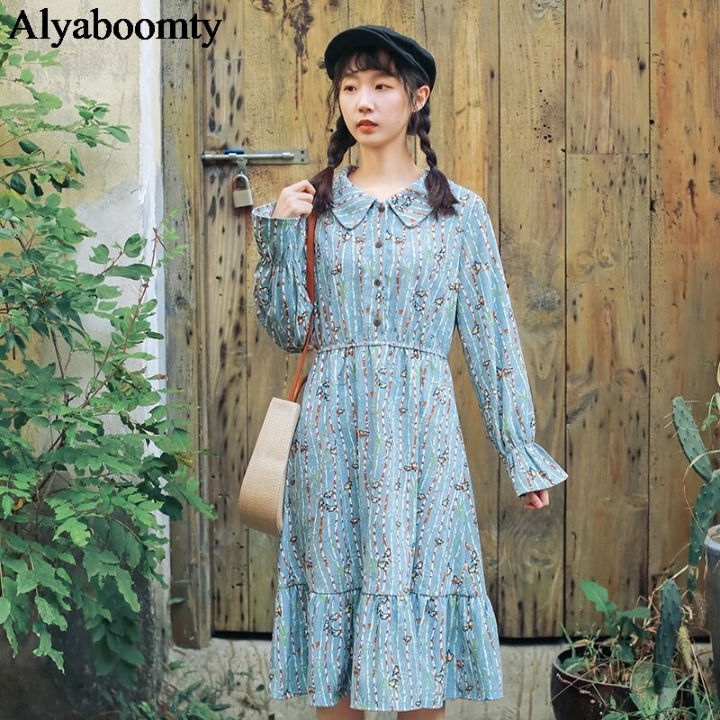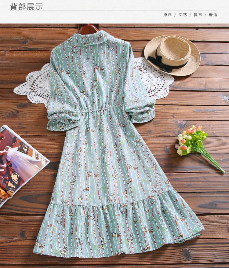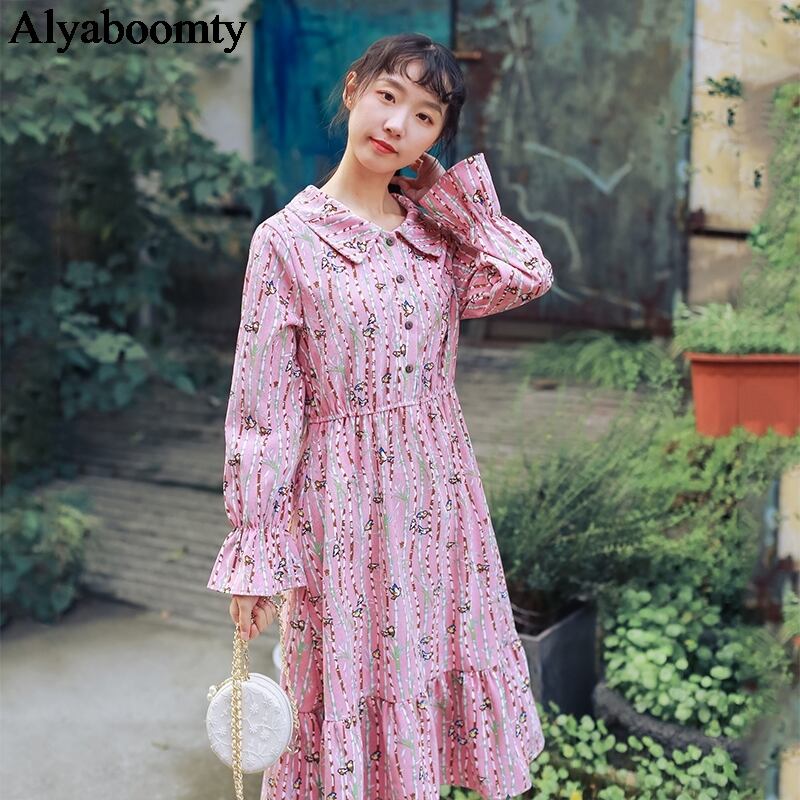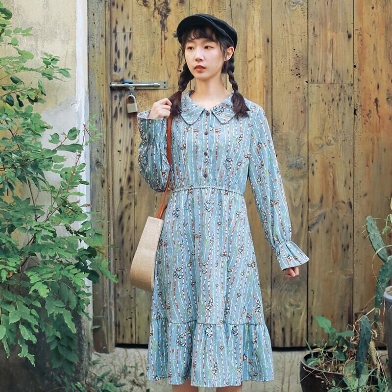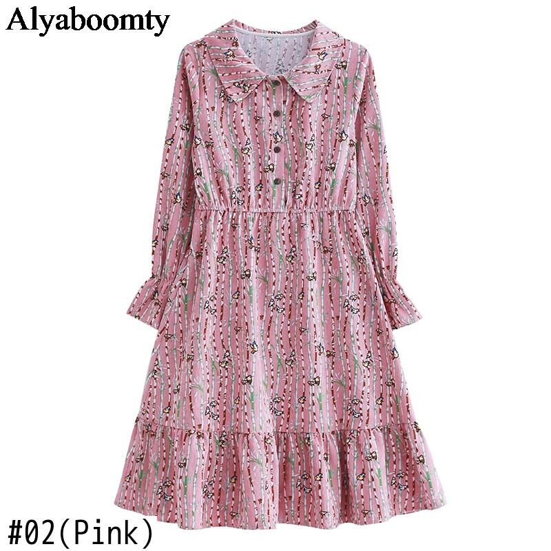 送料無料୨♥୧ 森スプリングオータム甘いレディースコーデュロイドレス 鳥パターンプリントストレッチウェストベスティドスフレアスリーブ AOS34347452102