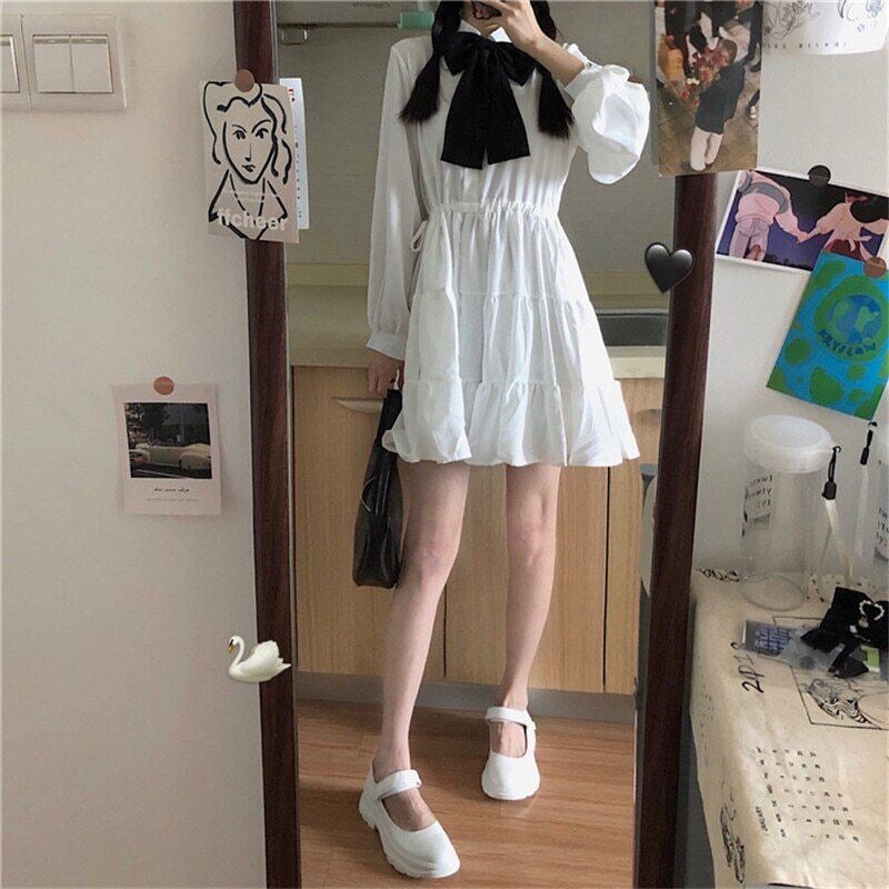 送料無料୨♥୧ ese原宿オータムレディースホワイトブラックドレス ゴシックパンクスタイル断るカラーリボン可愛いプリーツコスプレ AOS42638464663