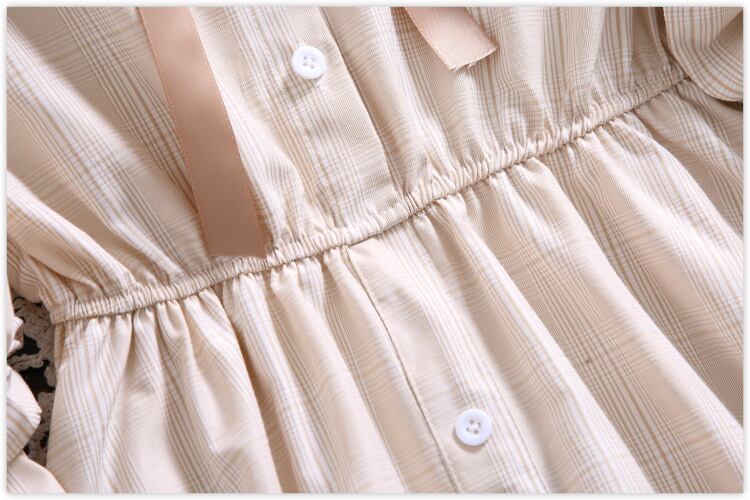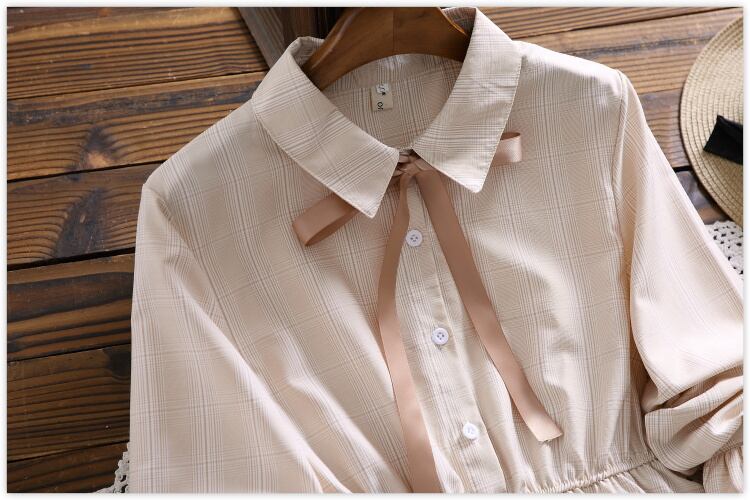 送料無料୨♥୧ スプリングオータムレディース断るカラーリボンアプリコット格子柄ドレス 森フレアスリーブシャツ AOS51323253025