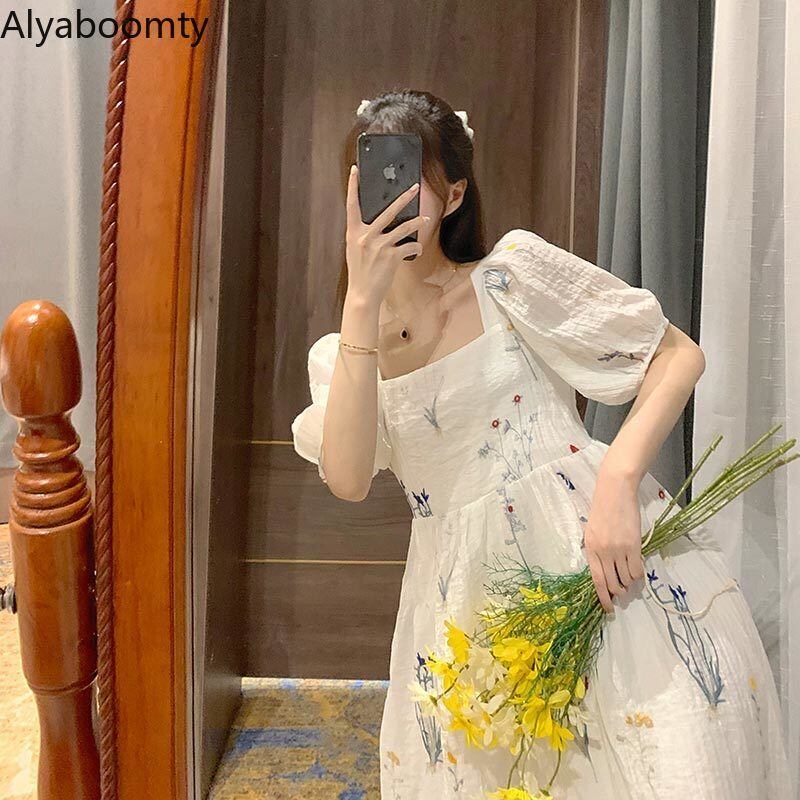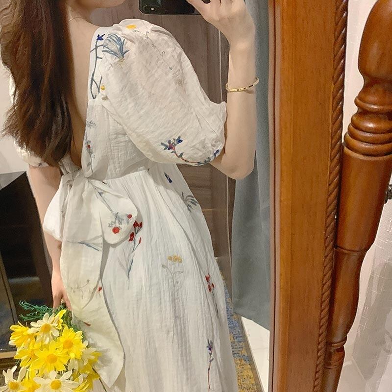 送料無料୨♥୧ 2021サマーレディースフランス語甘いドレス 平方カラーフローラル刺繍バギーパフスリーブリボンバックレス AOS25163146032