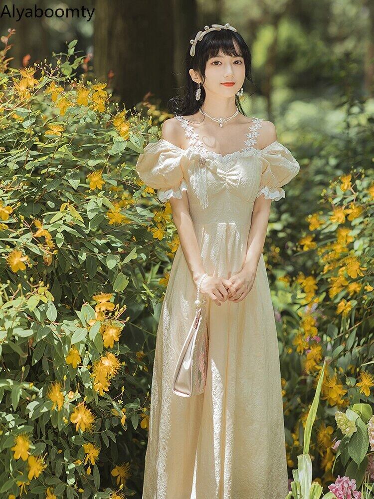 送料無料୨♥୧ サマーレディースフランス語ロング妖精レースフリルドレス スラッシュ首ストラップ オフショルダーベージュイエロージャカードパーティー AOS20741838611