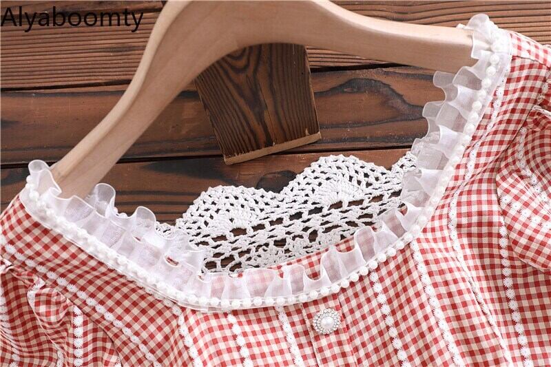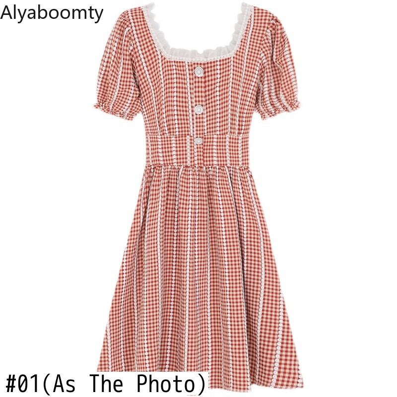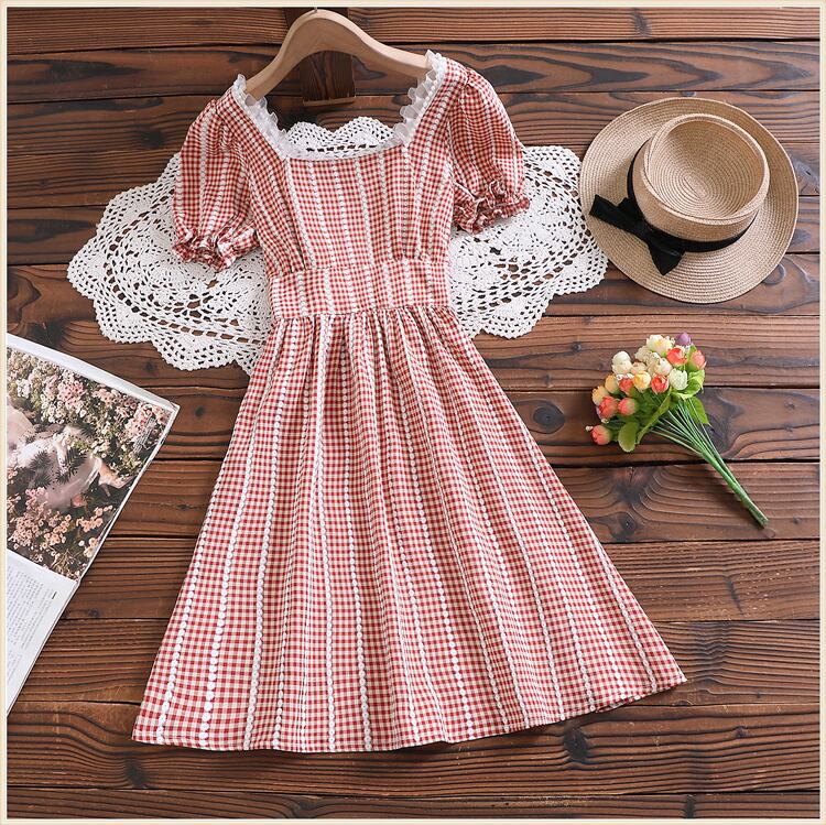 送料無料୨♥୧ 2021サマーレディース格子柄ドレス 平方カラーレースフリル半袖スリーブシックヴィンテージAライン AOS36695720137