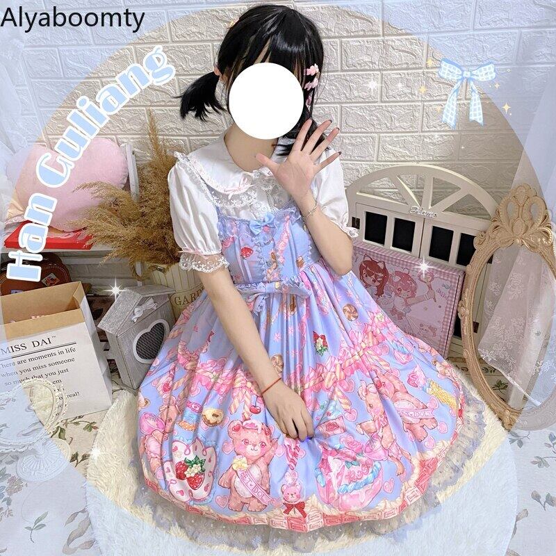 送料無料୨♥୧ eseレディース愛らしいjskドレス ピンクブルーブラックくまイチゴ漫画ノースリーブリボンレースフリルロリータ AOS31429472966