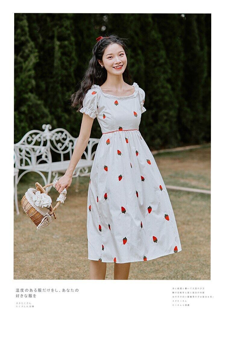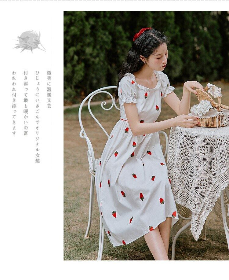 送料無料୨♥୧ 2021森サマーレディースホワイト甘いドレス 可愛いイチゴ刺繍半袖スリーブコットンシックドレス ワンピース AOS5583328480