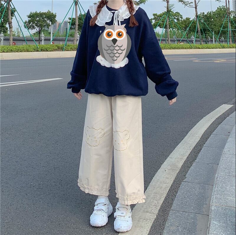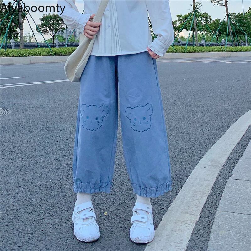 送料無料୨♥୧ eseスプリングオータムレディースワイドレッグパンツ ウェストアプリコットブルーくま刺繍trouses可愛いフリル学生 AOS19702448646