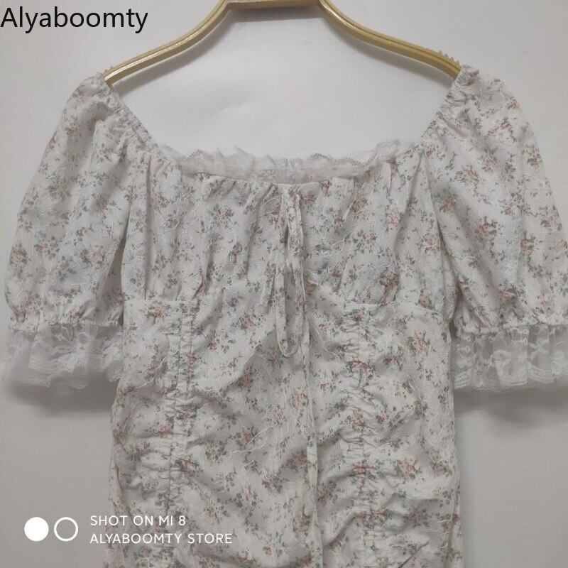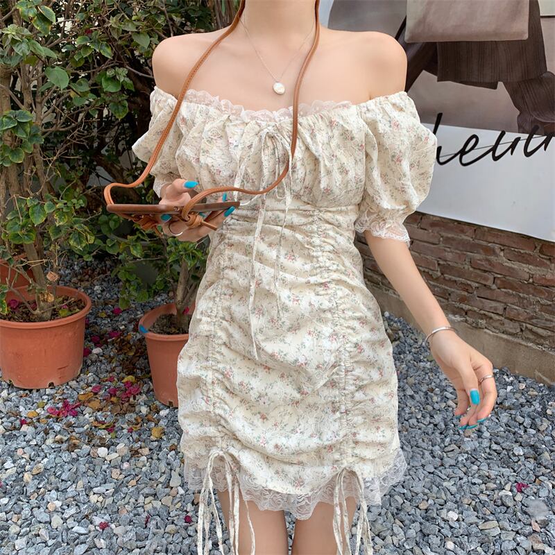 送料無料୨♥୧ 2021サマーレディースフランス語妖精ミニドレス スラッシュ首オフショルダーフローラルレースドローシックAライン AOS57090078201