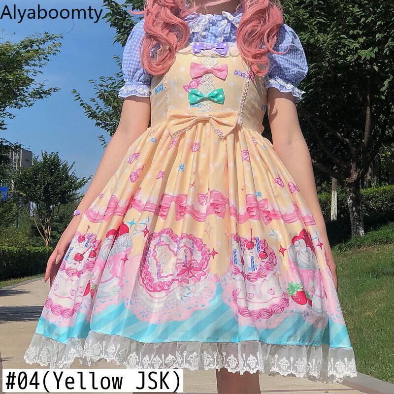 送料無料୨♥୧ eseレディースロリータsleelevessドレス ブラックブルーピンクイエローイチゴケーキプリント可愛いjsk AOS92831395704