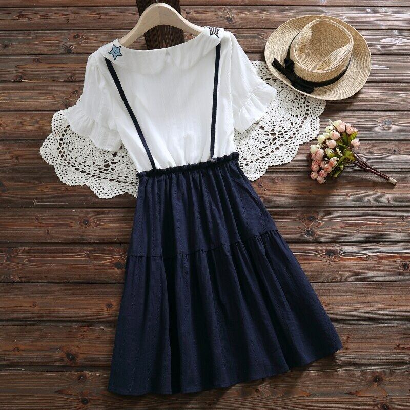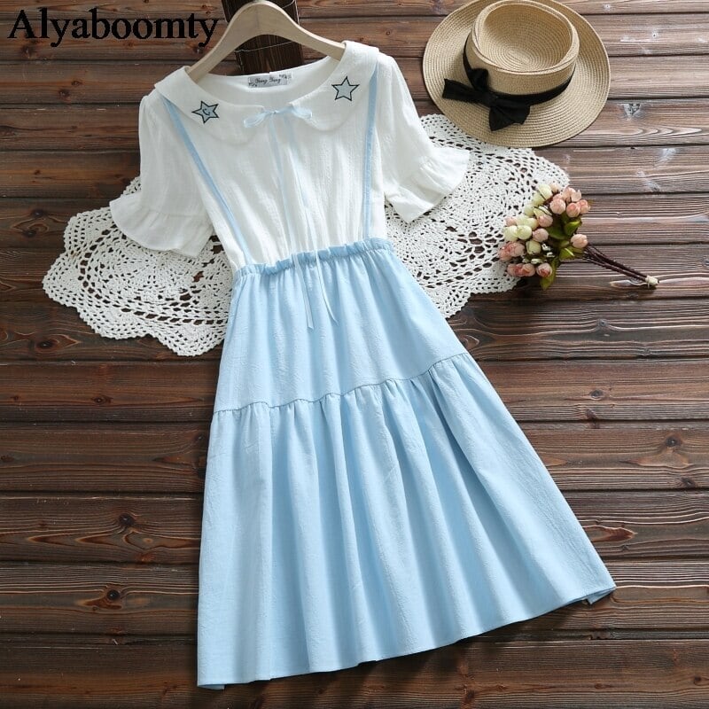 送料無料୨♥୧ 森サマーレディース甘いドレス ピーターパンカラーピンクブルー刺繍出演者プレッピースタイルコットン AOS9225646625