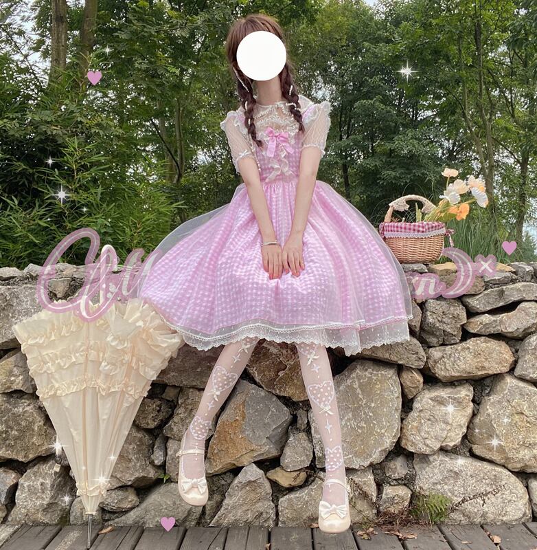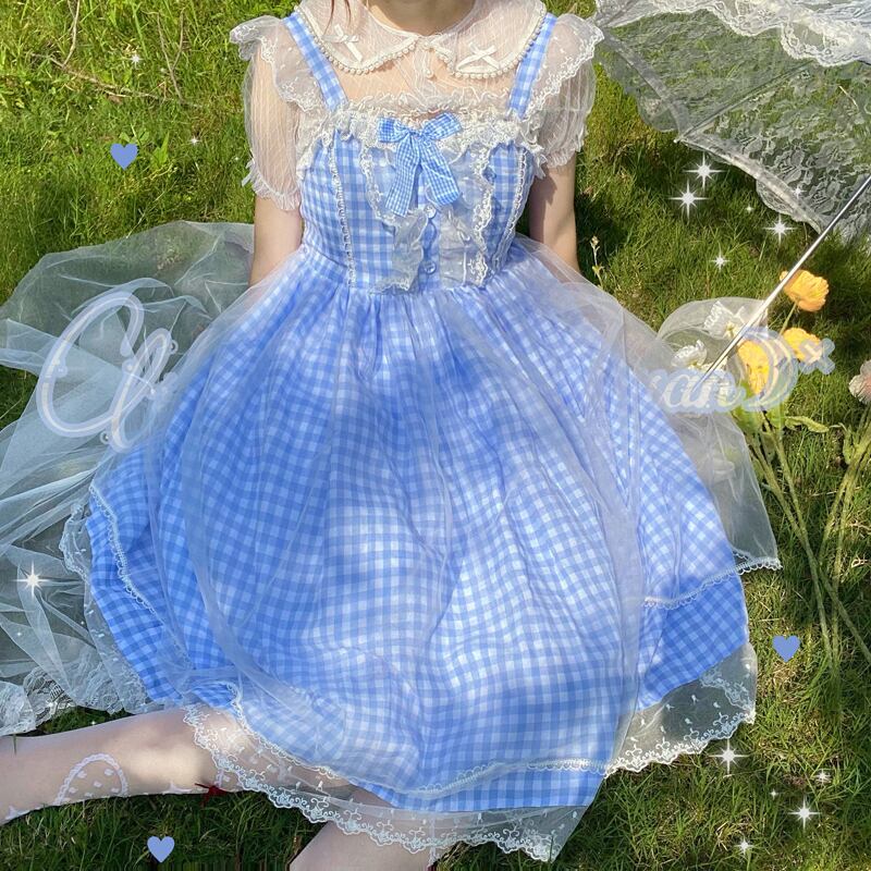 送料無料୨♥୧ eseサマーレディースピンクブルーjkドレス 格子柄メッシュパッチワークレースフリルノースリーブロリータリボン AOS25878622116