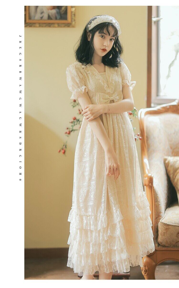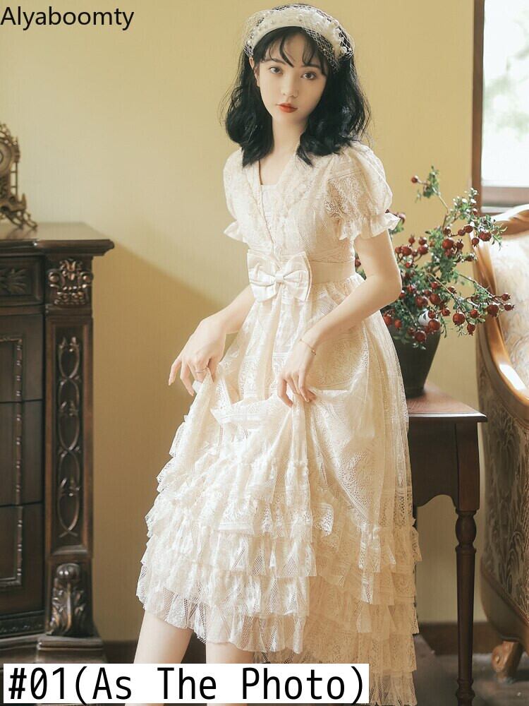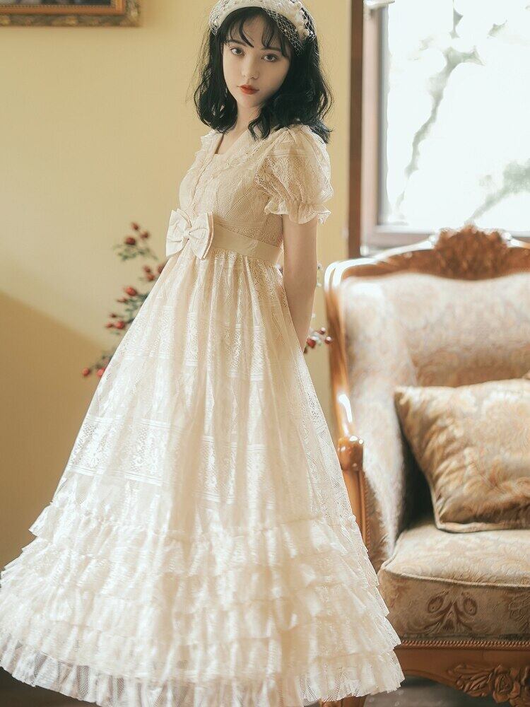 送料無料୨♥୧ サマーレディースヴィンテージロングロリータドレス Vネックウェストフリルパーティーホローでる AOS76782133814