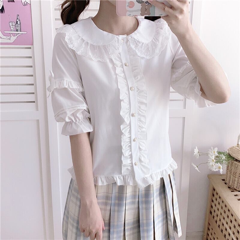 送料無料୨♥୧ eseサマーレディースロリータ可愛いブラウス ピーターパンカラーとレースリボン甘いシャツ 半袖スリーブホワイト愛らしいブルサトップス AOS85677459656