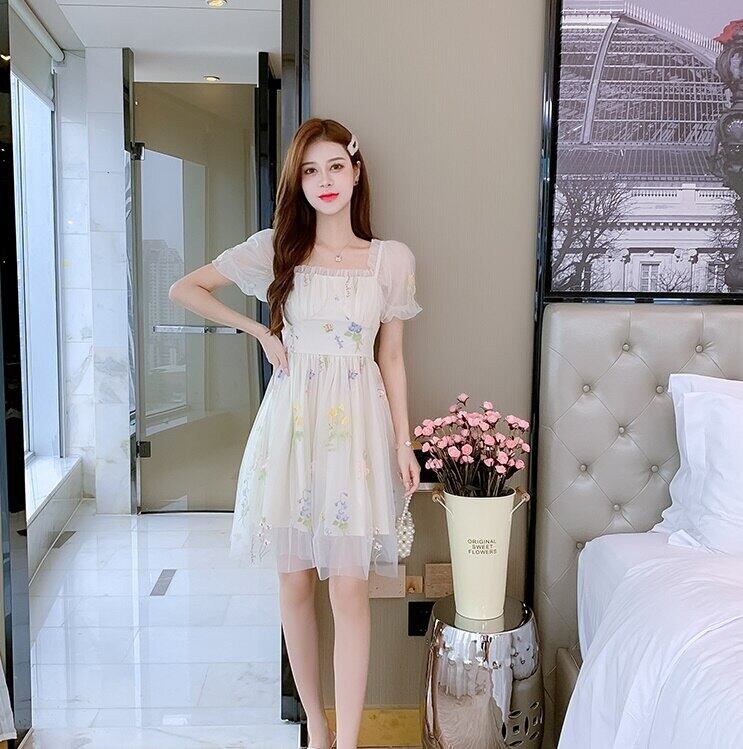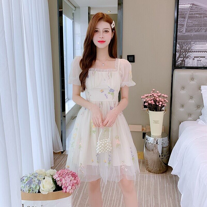 送料無料୨♥୧ 2021シックサマーレディースメッシュドレス 平方カラーフローラル刺繍甘い半袖スリーブパーティー AOS58598830449