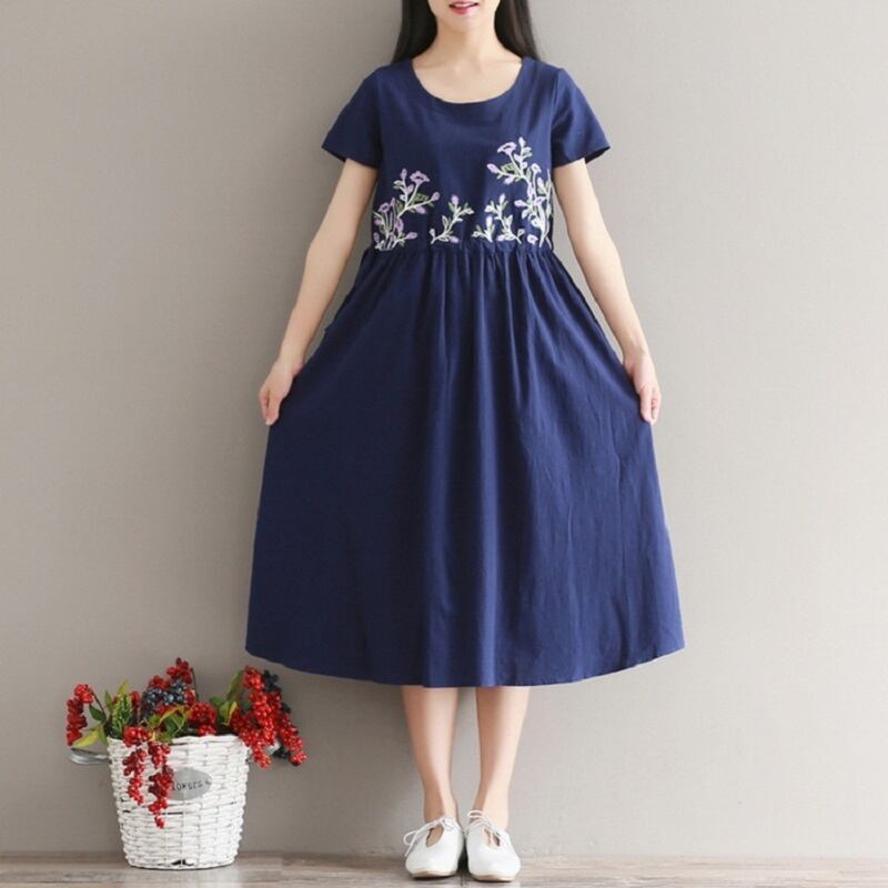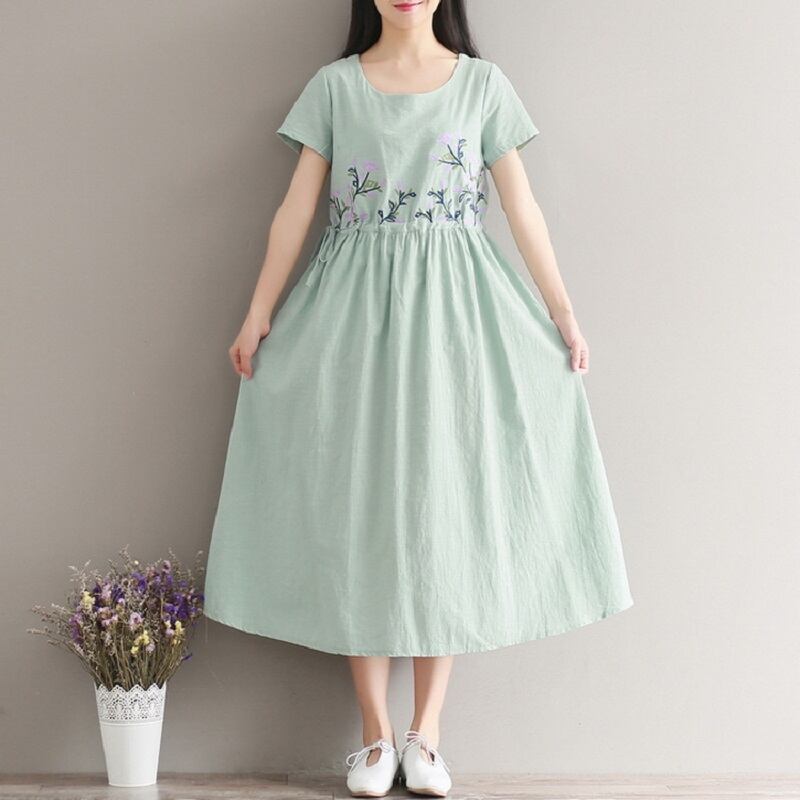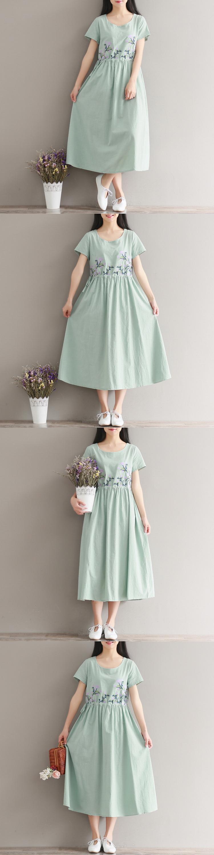 送料無料୨♥୧ 森サマーレディース刺繍ロングドレス ホワイトグリーンブルー半袖スリーブフェミニーズベスティドスコットンフローラル AOS50493824046
