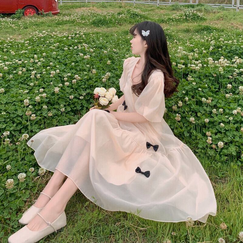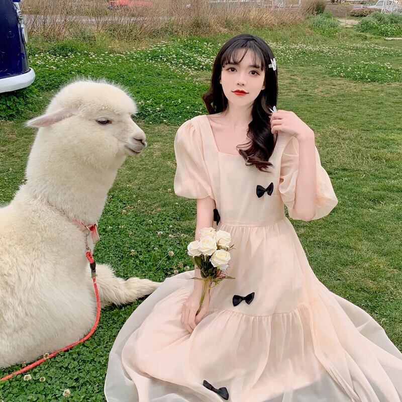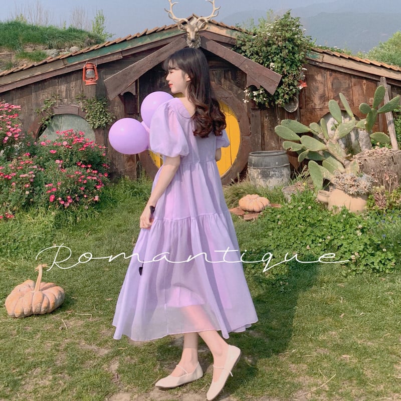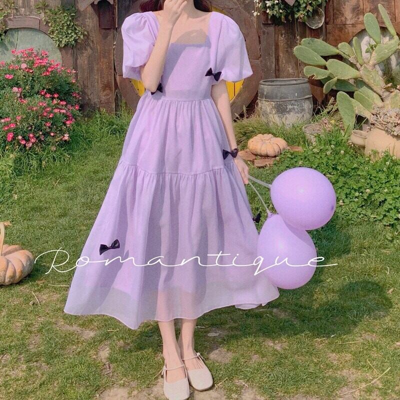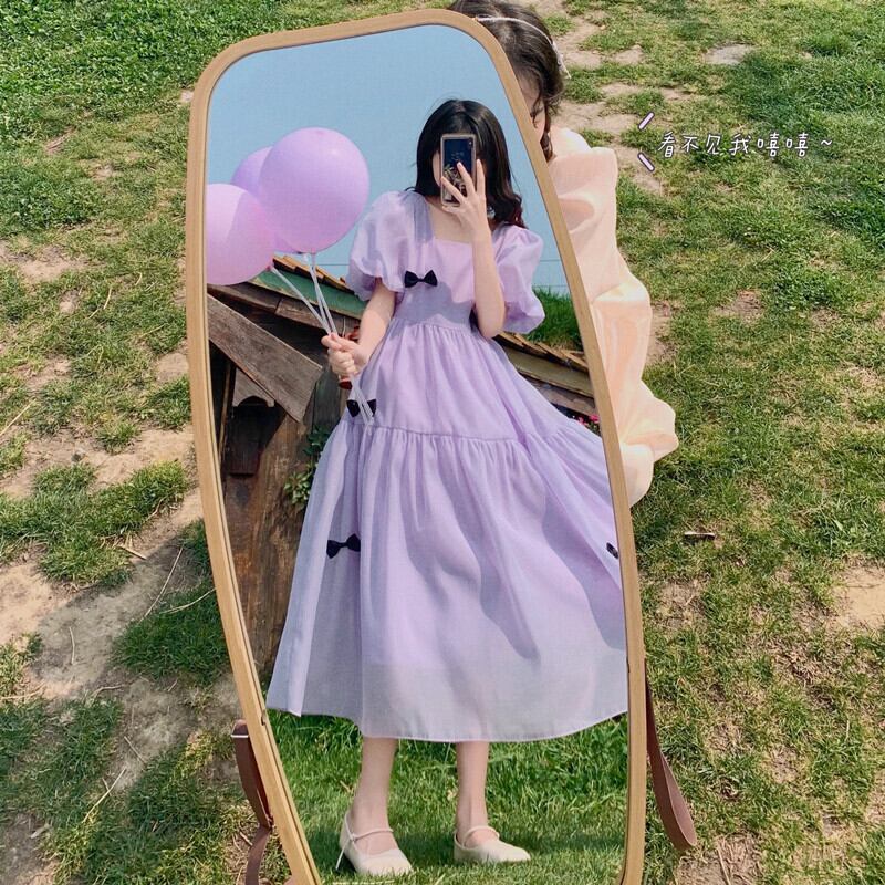 送料無料୨♥୧ 2021サマーレディースオーガンザロングドレス 平方カラーリボンアプリコット紫のフリルパフスリーブ可愛い甘いパーティードレス ワンピース AOS21770155840