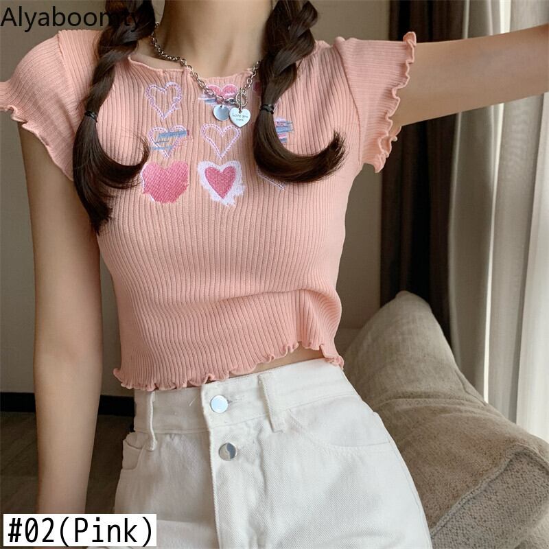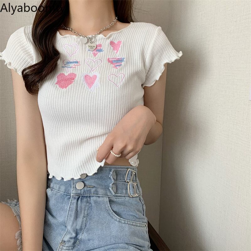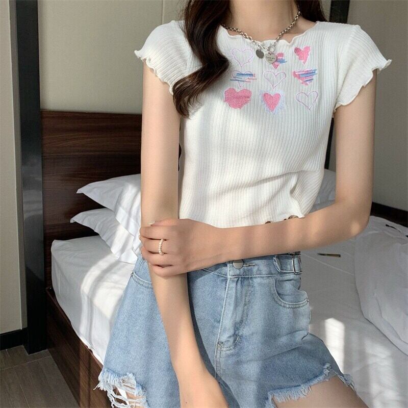 送料無料୨♥୧ 2021ese原宿サマーレディースストリートウェア収穫トップス ブラックホワイト紫のピンクニットTシャツ 可愛いハート刺繍ティー AOS69697966026