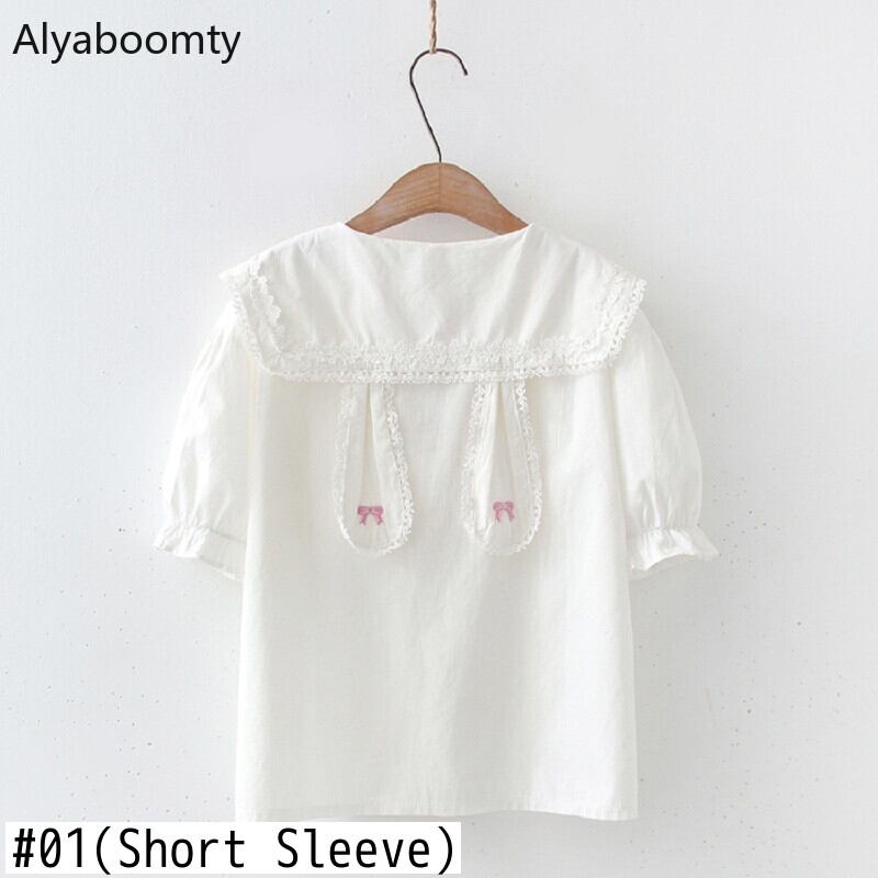 送料無料୨♥୧ 2021ロリータスタイルサマーレディースホワイトシャツ ピーターパンカラーとレースリボン刺繍可愛いブラウス バニーバギーjkブルサトップス AOS88382462639