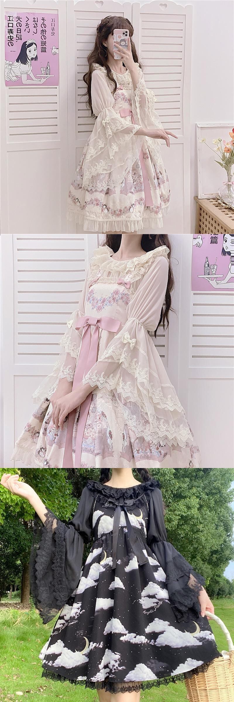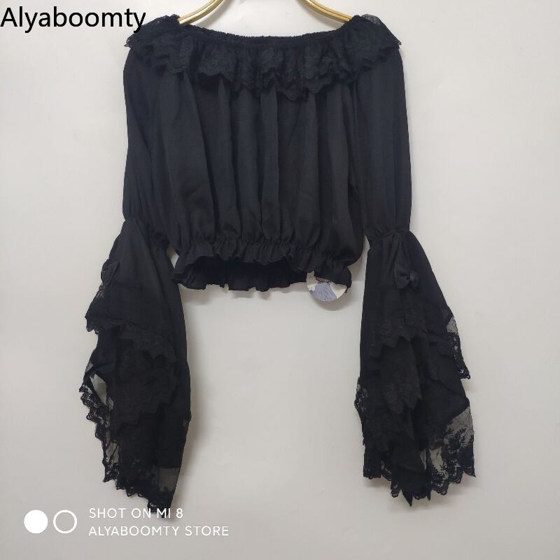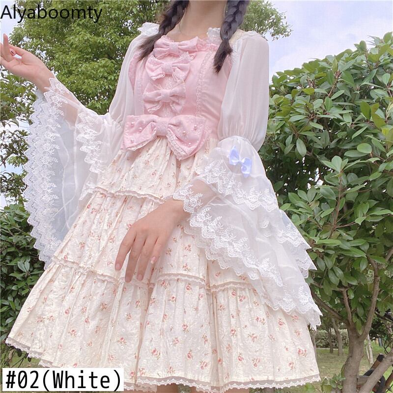 送料無料୨♥୧ eseレディーススタイリッシュロリータシャツ カラーホワイトブラックアプリコットシフォンレースブラウス フレアスリーブリボン可愛い収穫トップス AOS66446297778