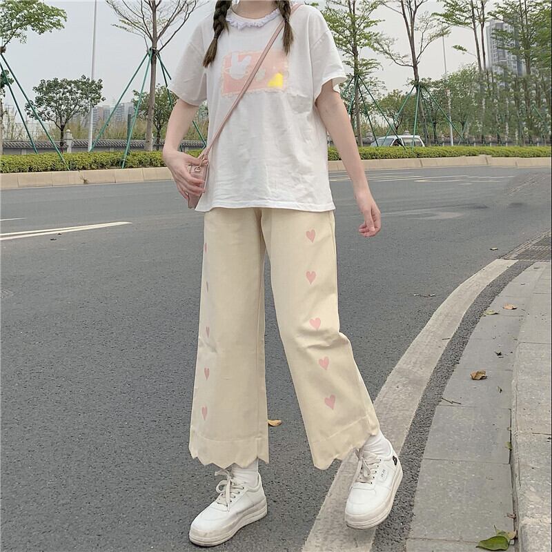 送料無料୨♥୧ 2021eseサマーオータムレディースウェストアプリコットピンクハートプリントズボン可愛い学生ワイドレッグパンツ AOS60577065607
