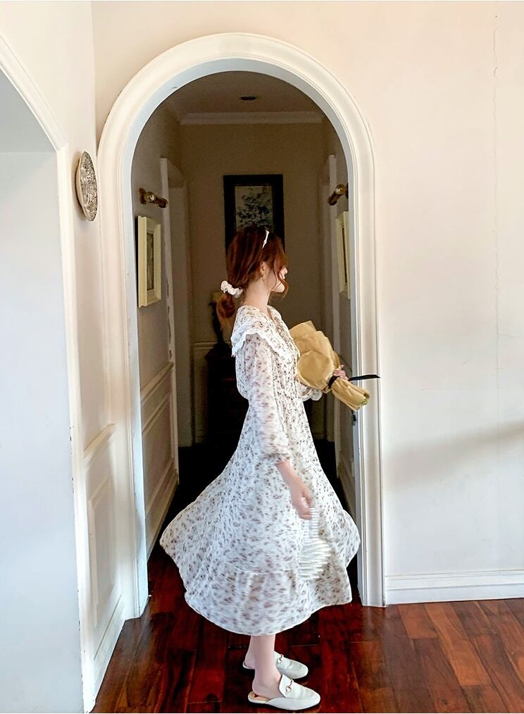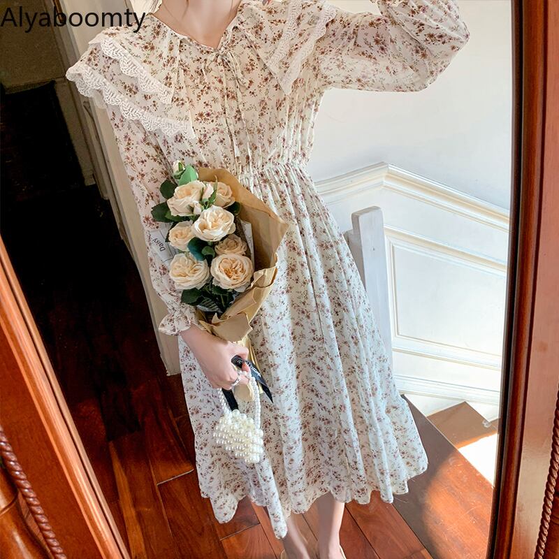 送料無料୨♥୧ 2021森スプリングオータムレディースミディドレス レースカラーフローラル甘い草原シックシフォンフリル AOS84174032952
