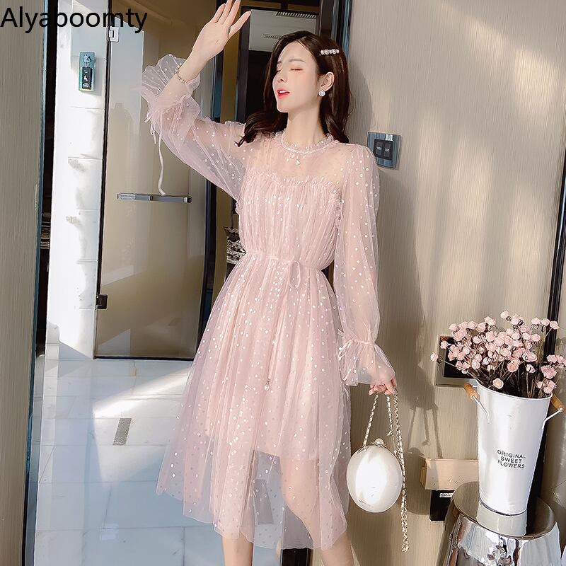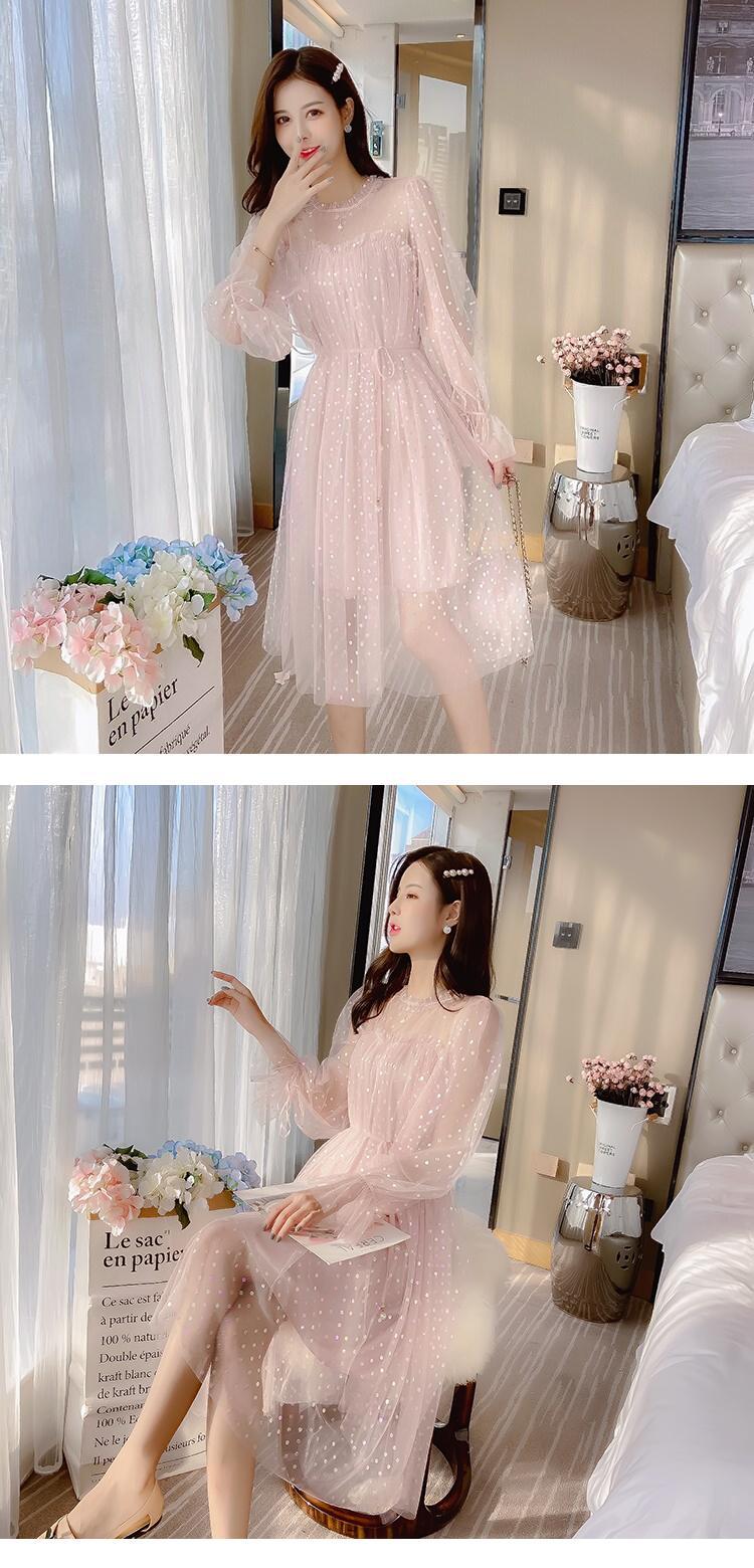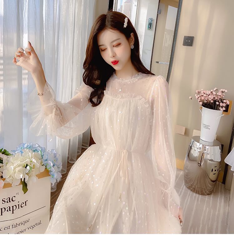 送料無料୨♥୧ 2021オータムレディースメッシュ妖精ドレス ベージュピンクサッシチュールフレアスリーブシックミディパーティー AOS6629801710