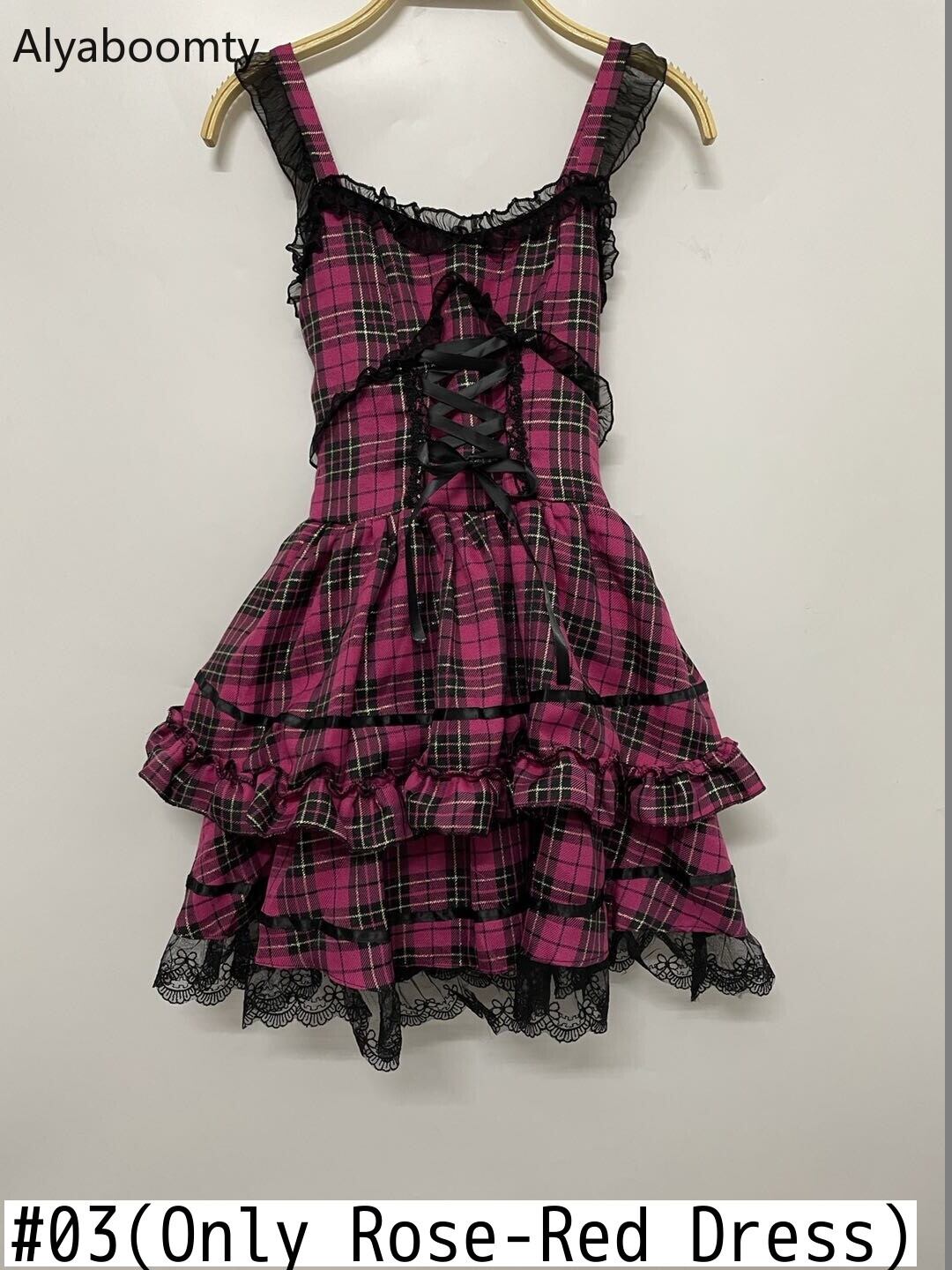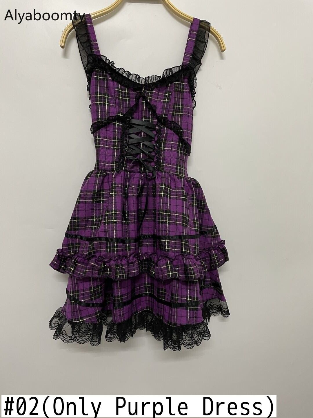送料無料୨♥୧ サマーレディースゴシック玉ガウンドレス 原宿パンクスタイル紫のローズレッド格子柄レースフリルロリータ AOS13261507474