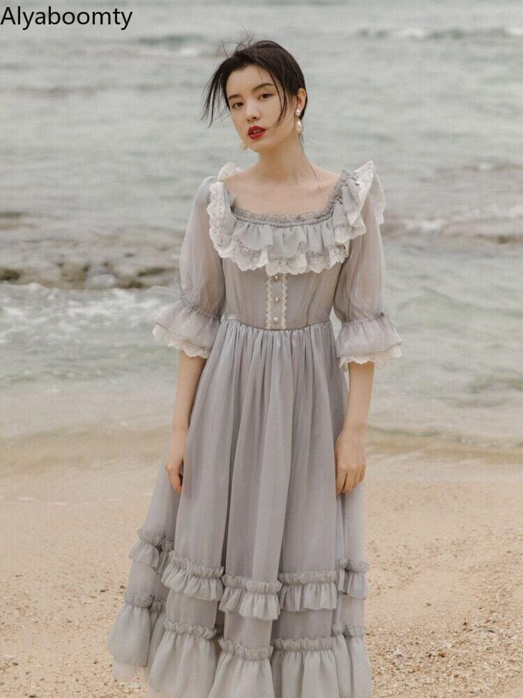送料無料୨♥୧ サマーレディース妖精ロングドレス フランス語スタイルゴージャスレースフリルメッシュパーティー AOS9728943753