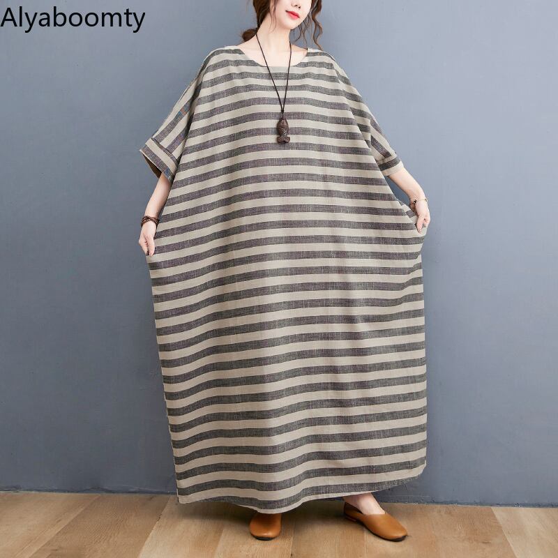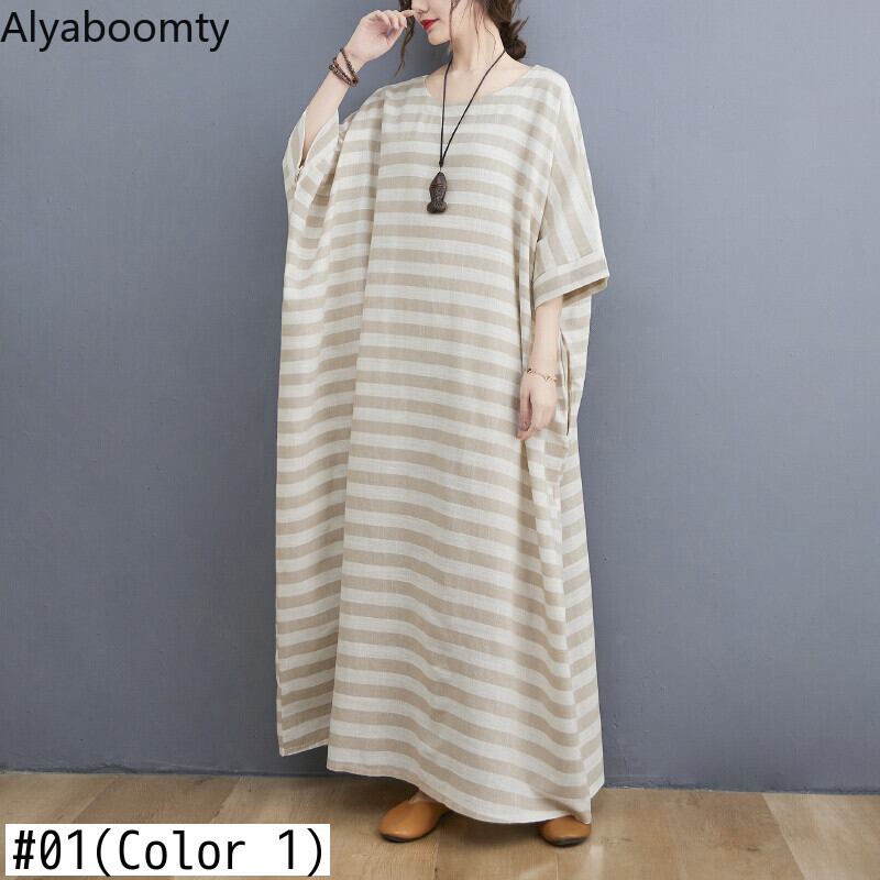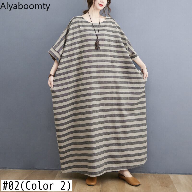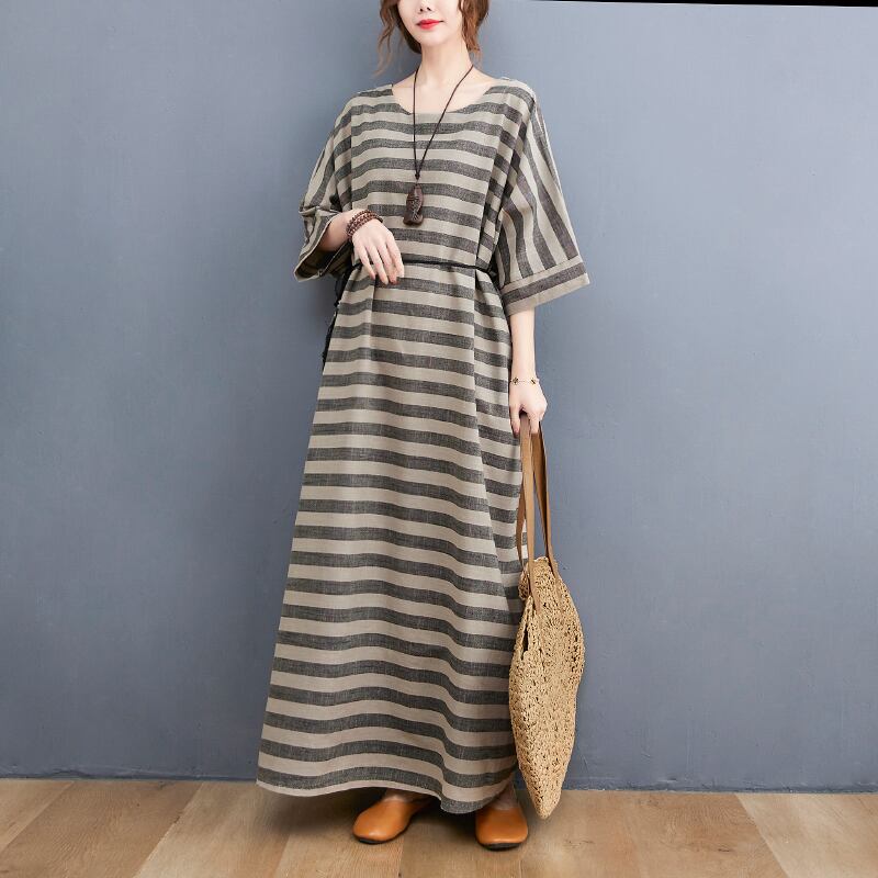 送料無料୨♥୧ サマーオータムレディース特大マキシロングドレス コントラストカラーストライプバギールーズガウンバットウィングスリーブベルト ヴィンテージ AOS40724478020