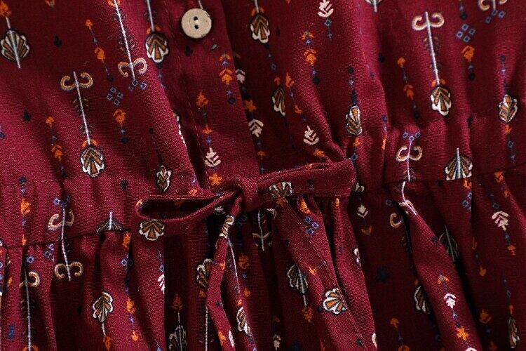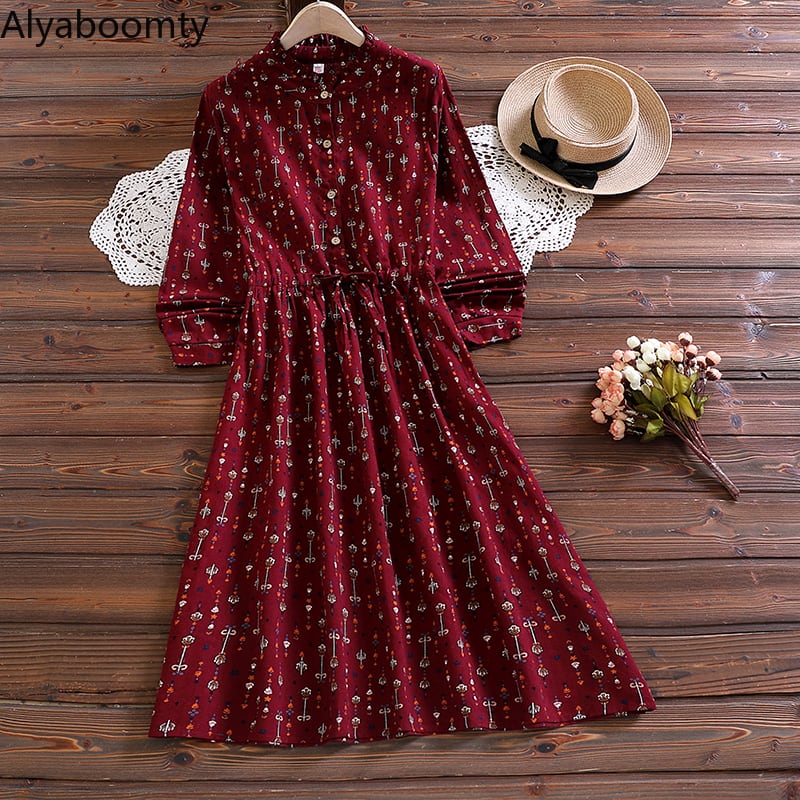 送料無料୨♥୧ オータムスプリングレディースAラインミディドレス カラーウェストフローラルプリントコーデュロイ AOS86026692762