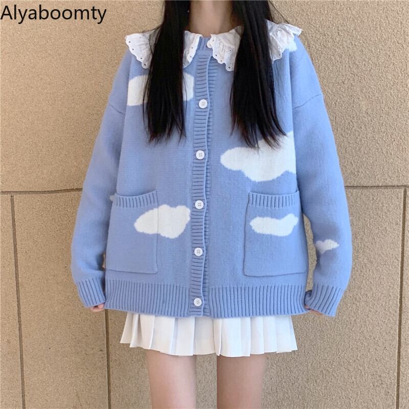 送料無料୨♥୧ eseプレッピースタイルオータムウィンターレディースアウターブルー雲特大セーター カーディガンルーズ可愛い AOS77630106178