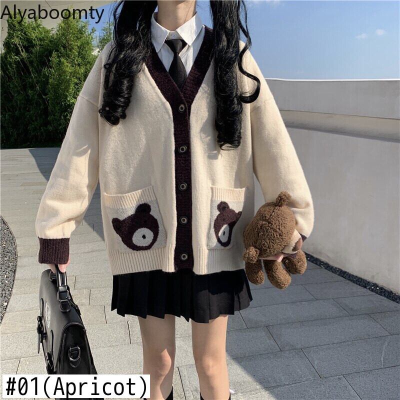 送料無料୨♥୧ eseオータムウィンターレディース特大アウターVネックアプリコットコーヒー漫画ニットカーディガン可愛いくまセーター AOS94437337857