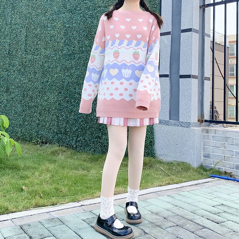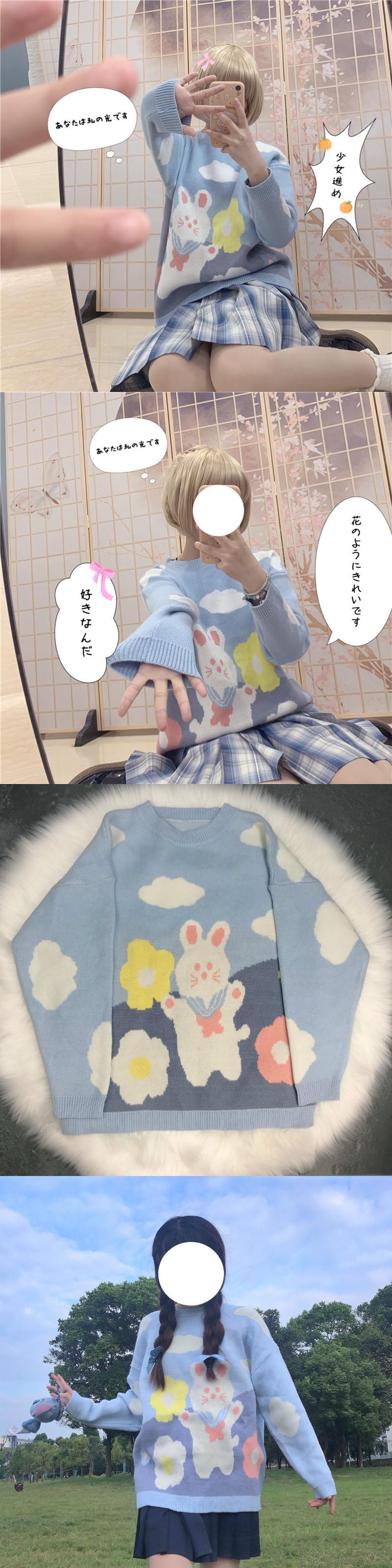 送料無料୨♥୧ eseオータムウィンターレディースロリータセーター ピンクブルーいちご/うさぎ雲ニットプルオーバー 可愛いハートウサギ AOS13574302264