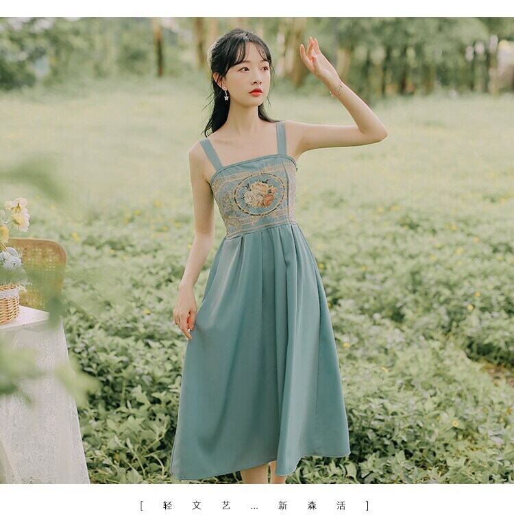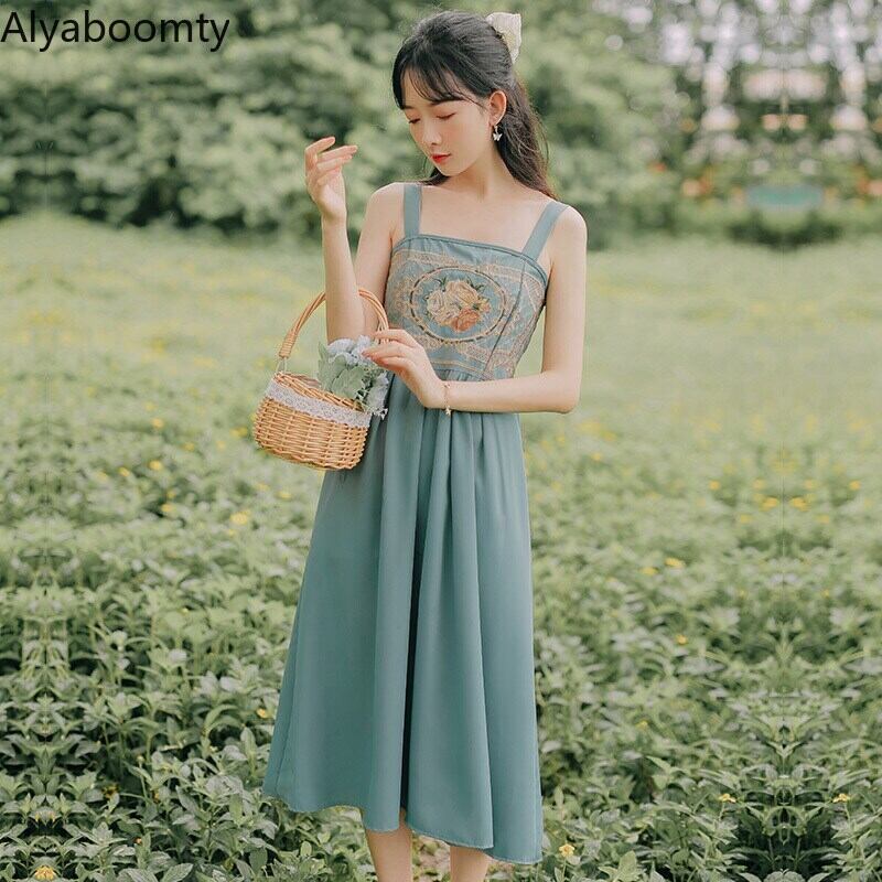 送料無料୨♥୧ 森サマーレディースドレス ブルーイエローフローラル刺繍ノースリーブヴィンテージシックAラインミディ AOS77207200271