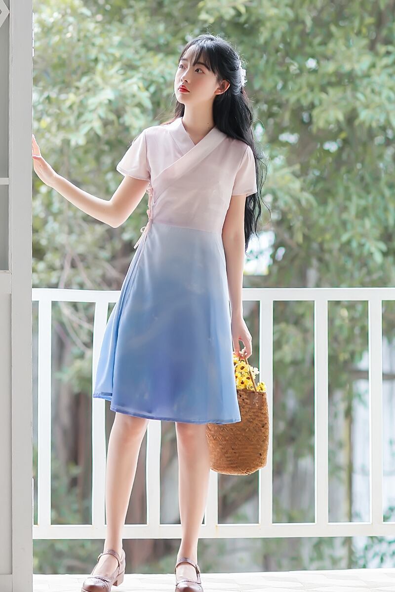 送料無料୨♥୧ 中国語ヴィンテージスタイルサマーレディースAラインドレス クロスVネックコントラストカラーバンド半袖スリーブドレス ワンピース AOS89530846326