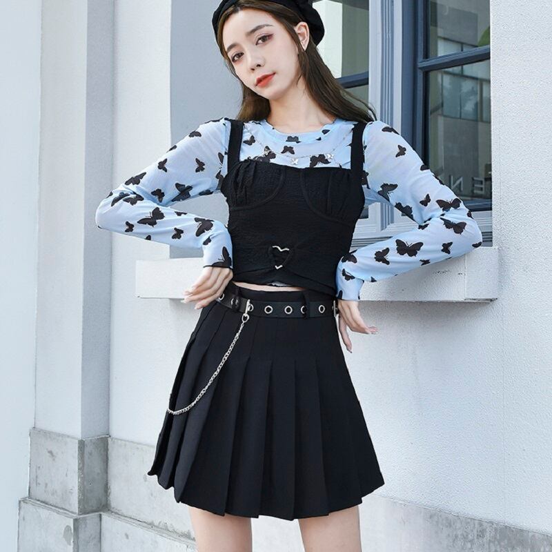 送料無料୨♥୧ ese原宿レディース2個セット パッチワークButterflyデザイン 収穫ミニプリーツスカート とサッシ可愛いゴシック AOS93942689624