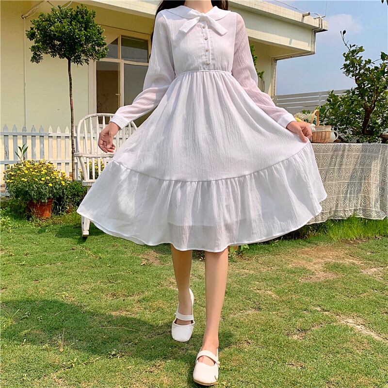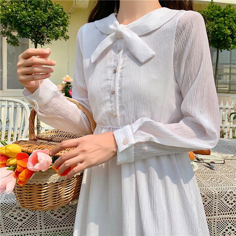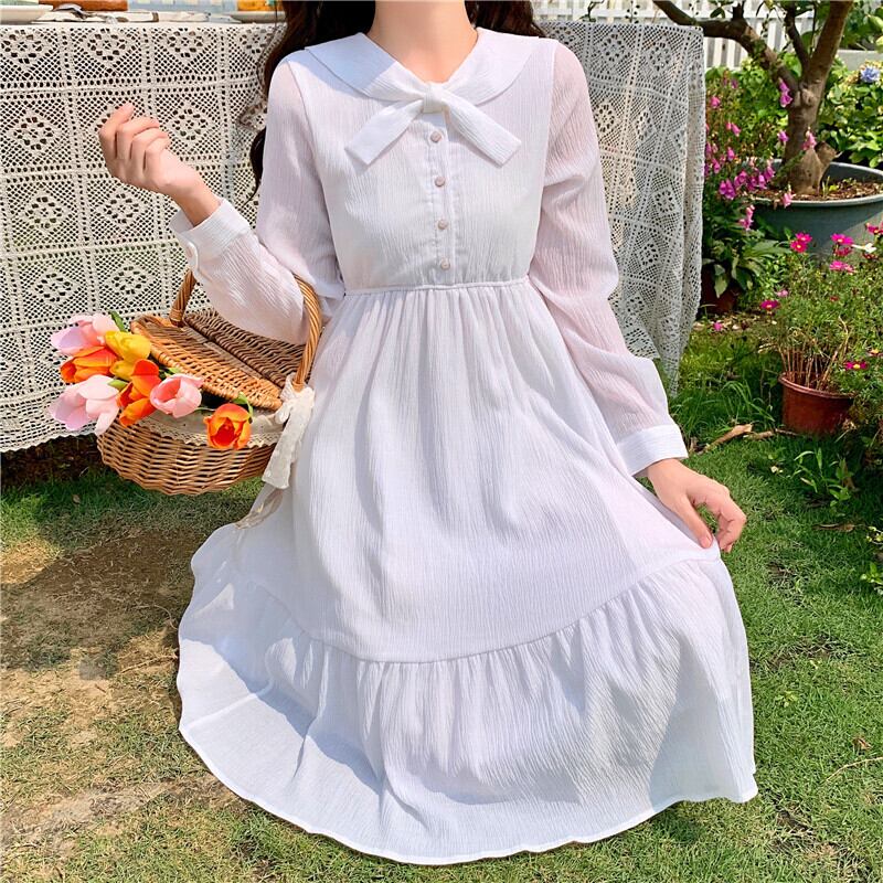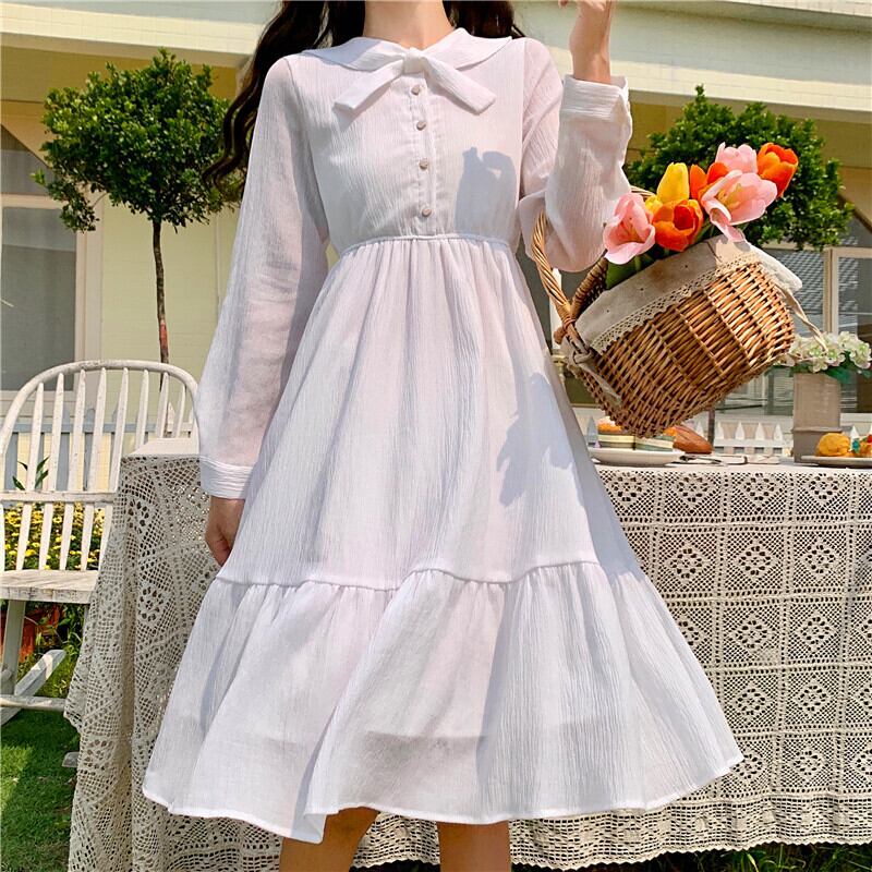 送料無料୨♥୧ オータムスプリングレディースホワイト甘いドレス ピーターパンカラーリボン可愛いロリータフリル' s AOS33373136242