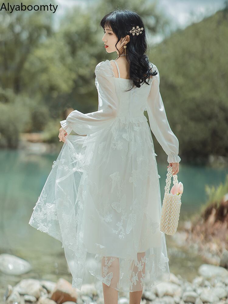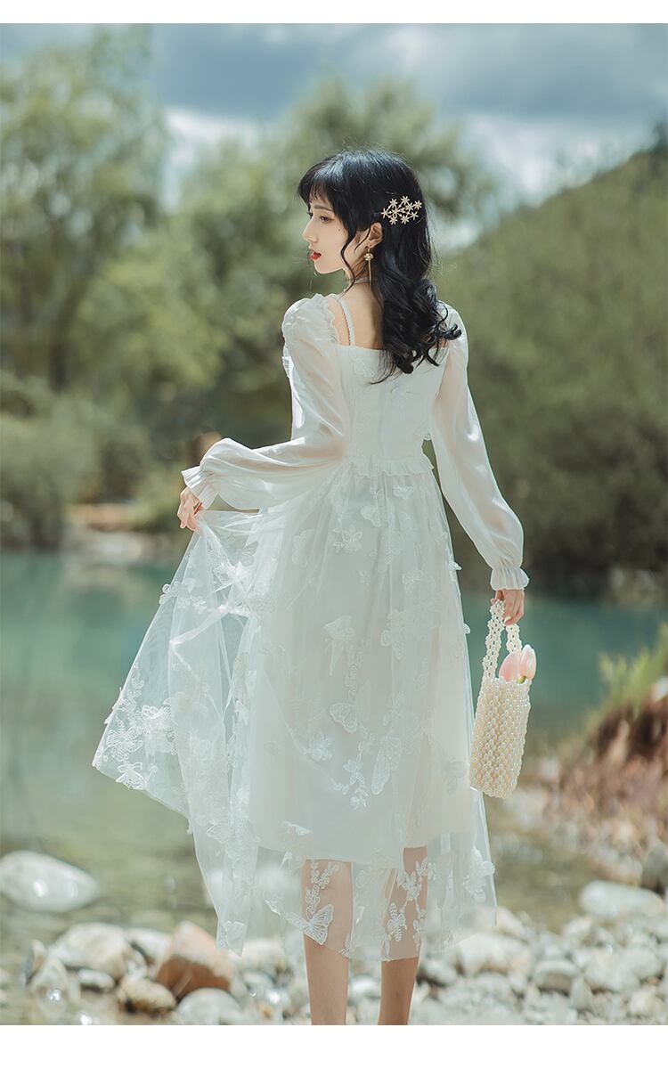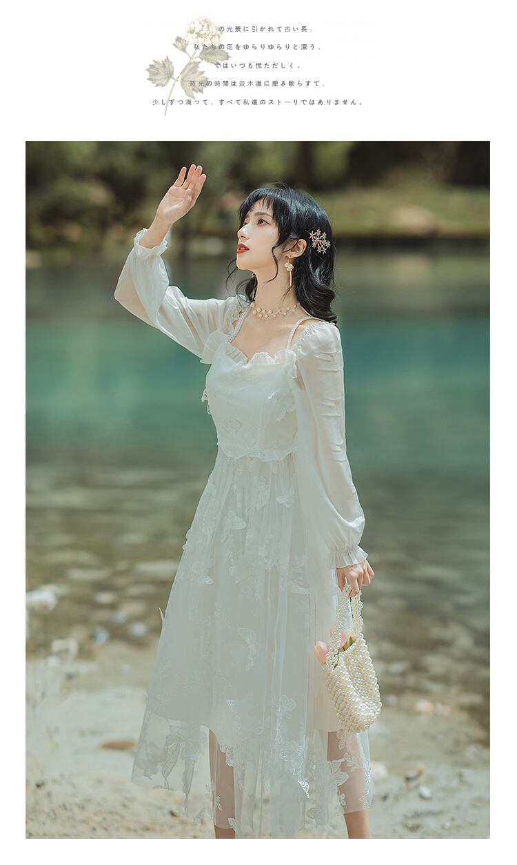 送料無料୨♥୧ スプリングオータムフランス語レディース妖精ミディドレス パールButterflyデザイン パーティーシック AOS48745736846