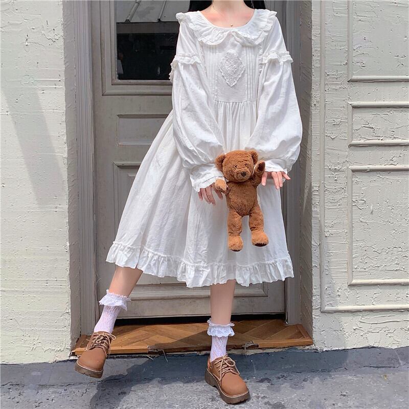 送料無料୨♥୧ eseロリータスタイルスプリング秋レディースホワイトドレス ピーターパンカラーフリル特大サッシランタンスリーブコットン AOS94455008518