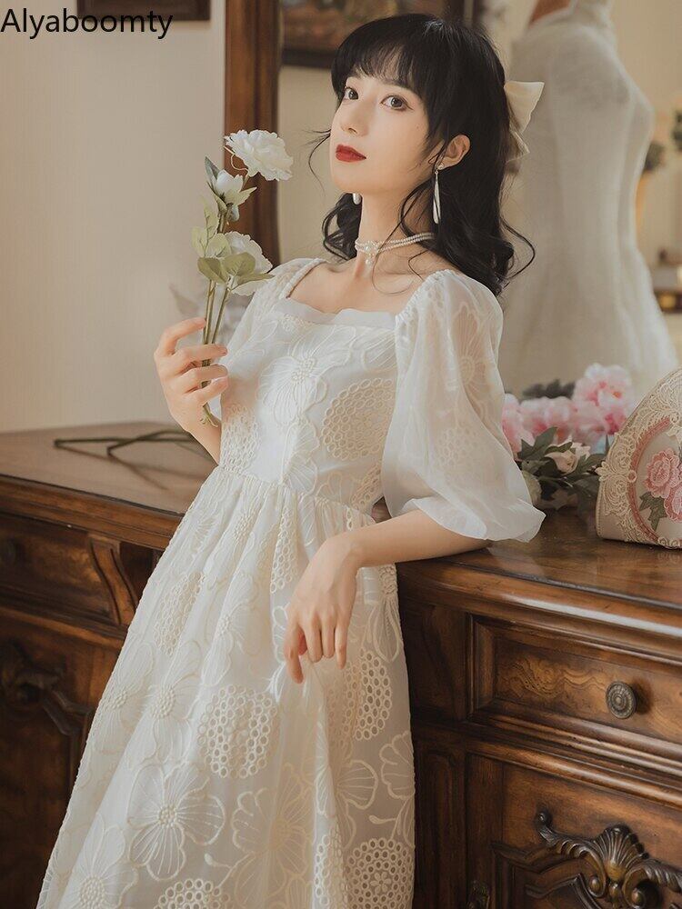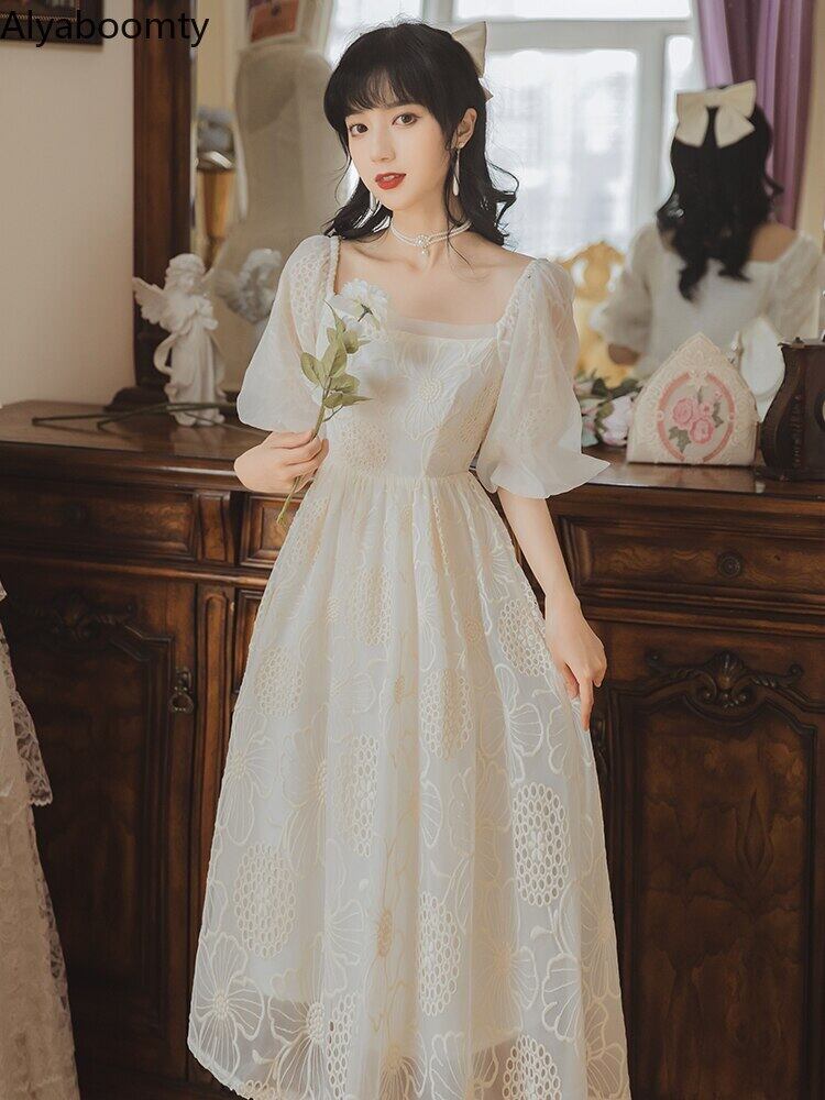 送料無料୨♥୧ サマーレディースフランス語妖精ドレス 平方カラーフローラル刺繍ホローでるメッシュパフスリーブシックパーティーレディ AOS38538661787