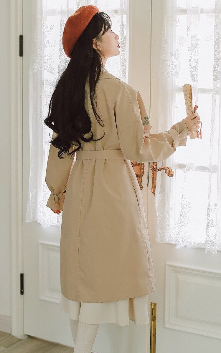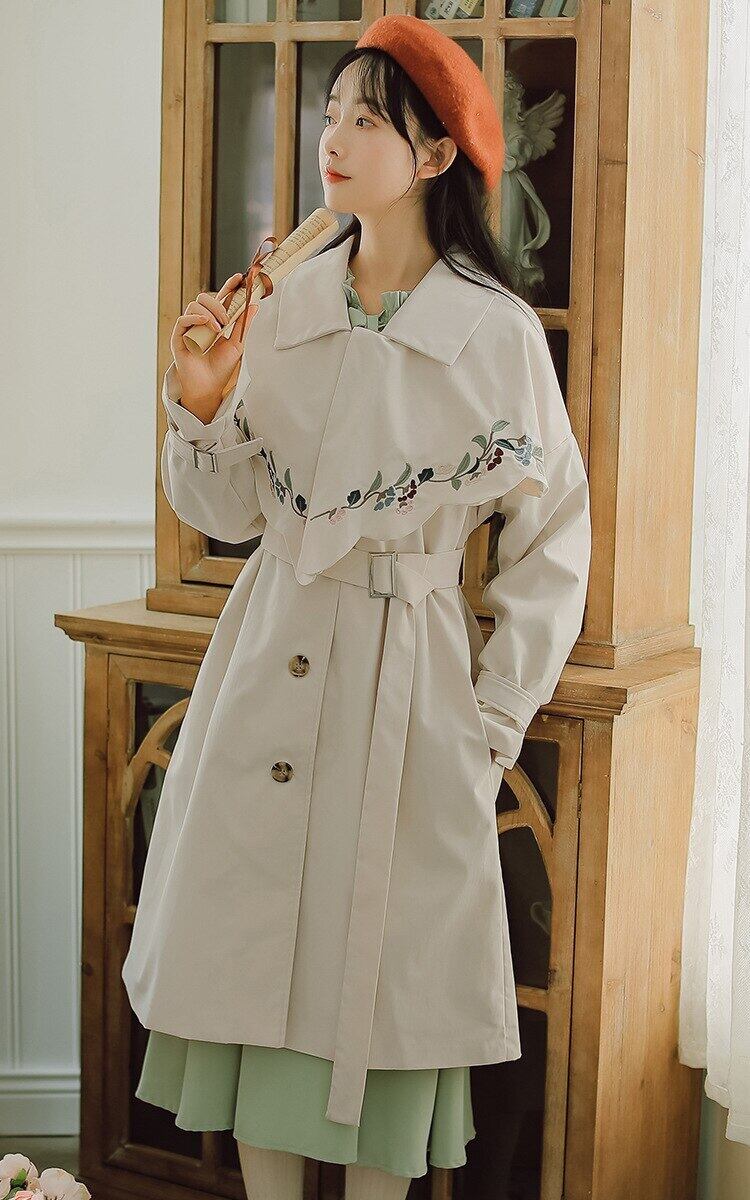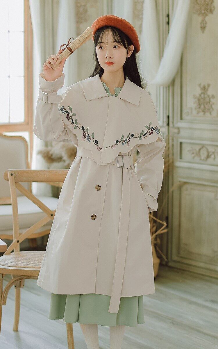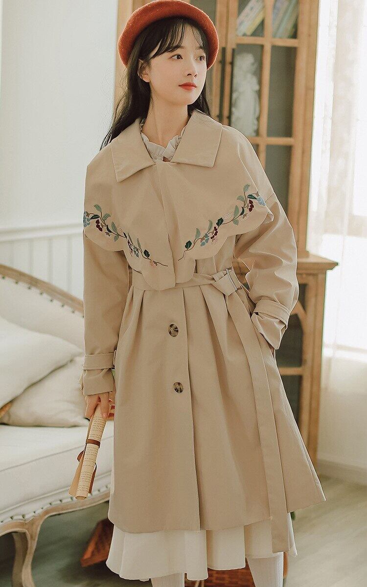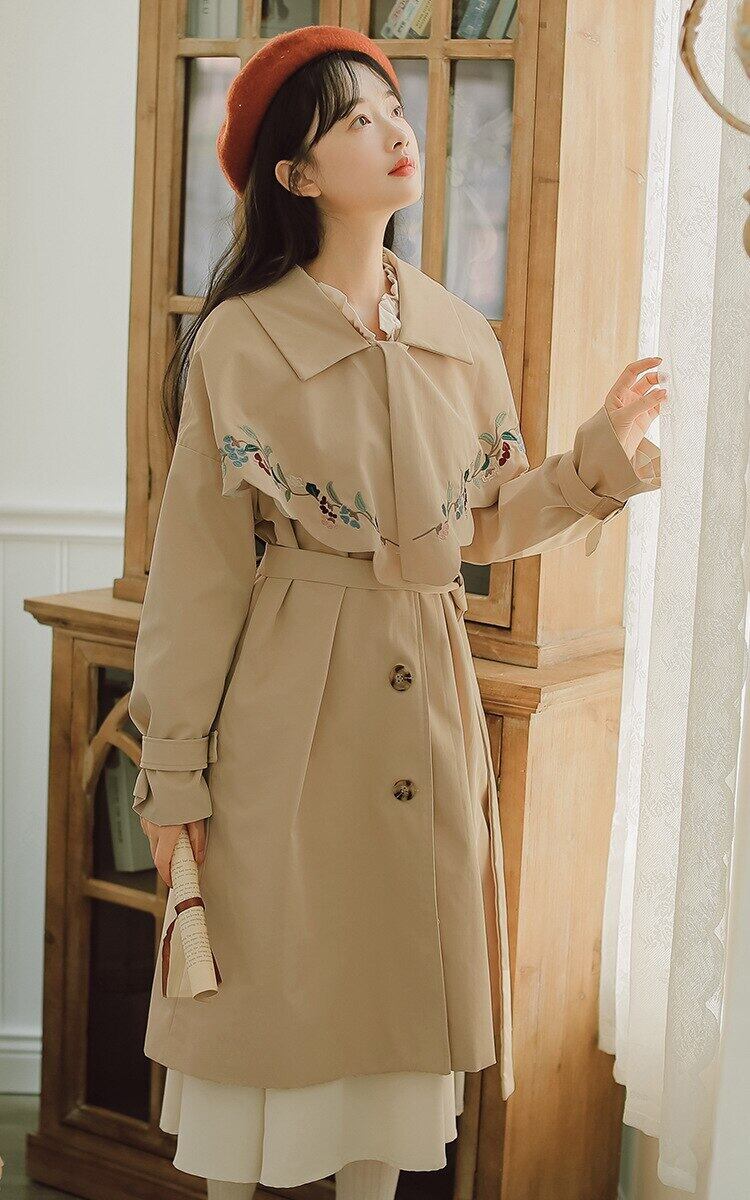 送料無料୨♥୧ 森スプリングオータムレディース溝断るカラーアプリコットカーキフローラル刺繍ロングコート ヴィンテージスタイリッシュ AOS27205212903