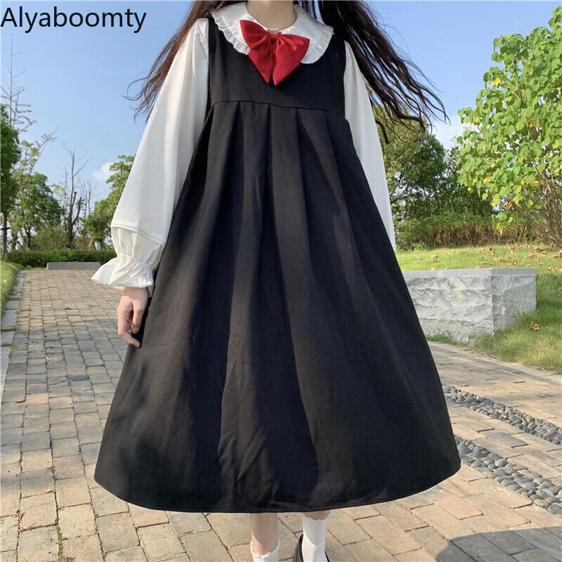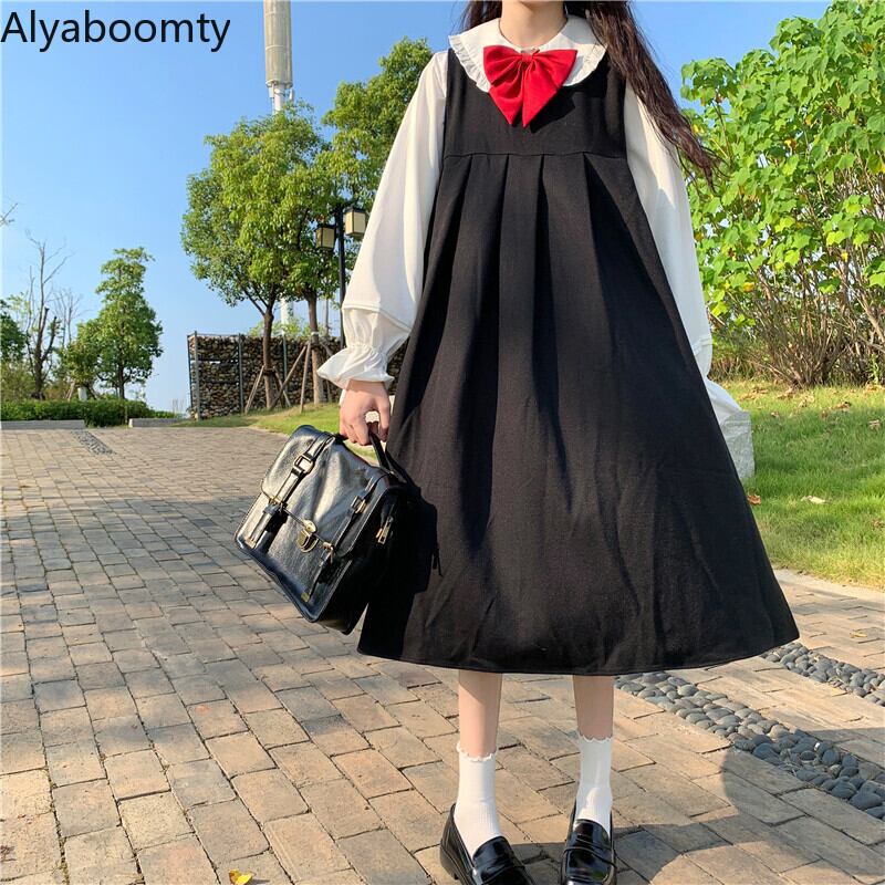 送料無料୨♥୧ eseプレッピースタイルレディースブラックタンクドレス スプリングオータムjk可愛い学生プリーツミディノースリーブ AOS96011268405