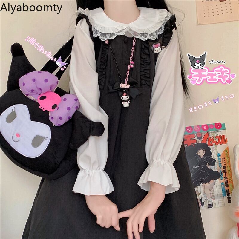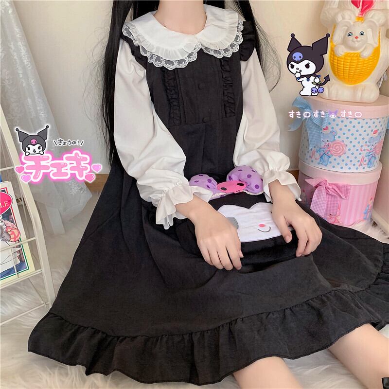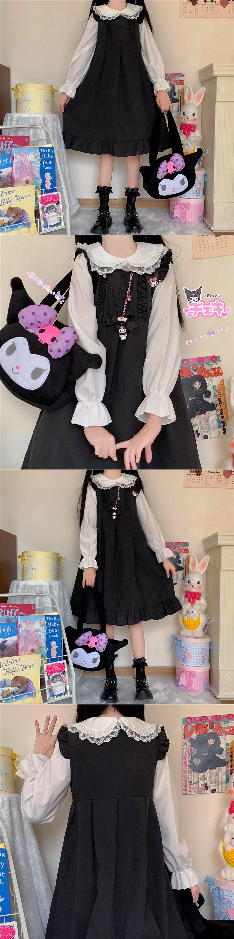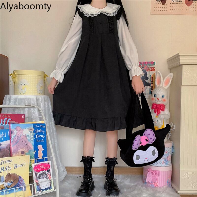 送料無料୨♥୧ eseプレッピースタイルレディース可愛いドレス ブラックピンクルーズオータムスプリングロリータフリルノースリーブ AOS72463308299