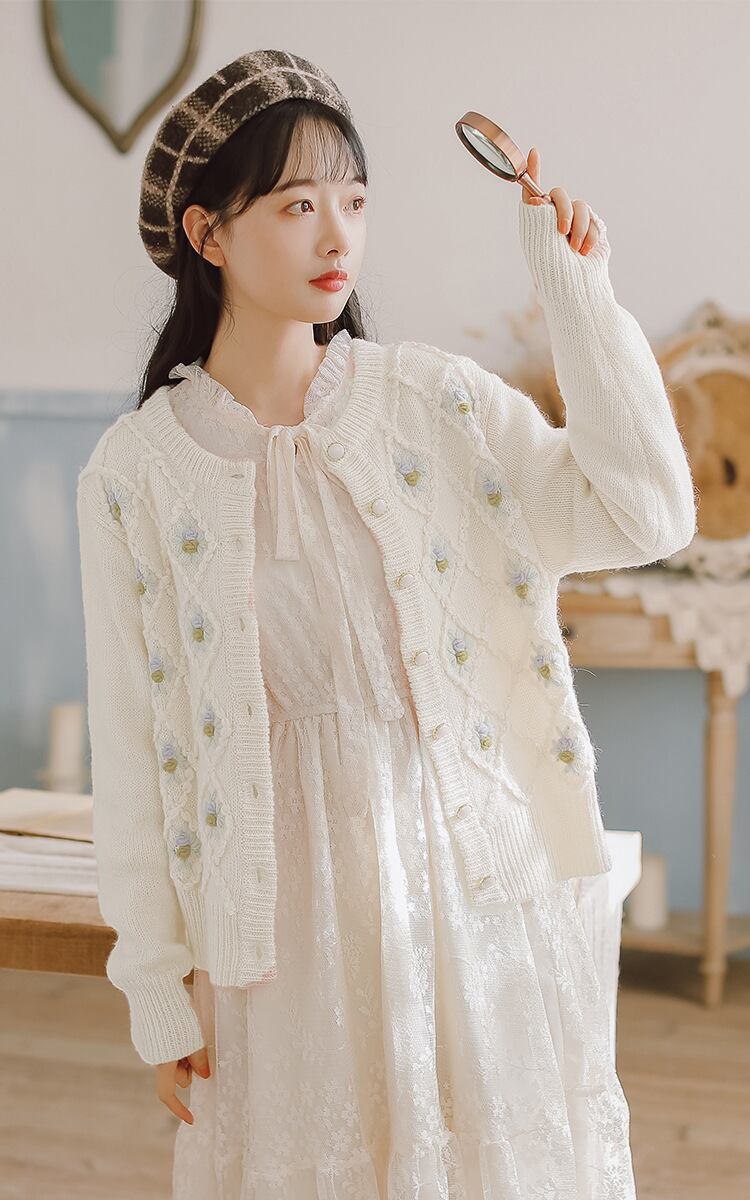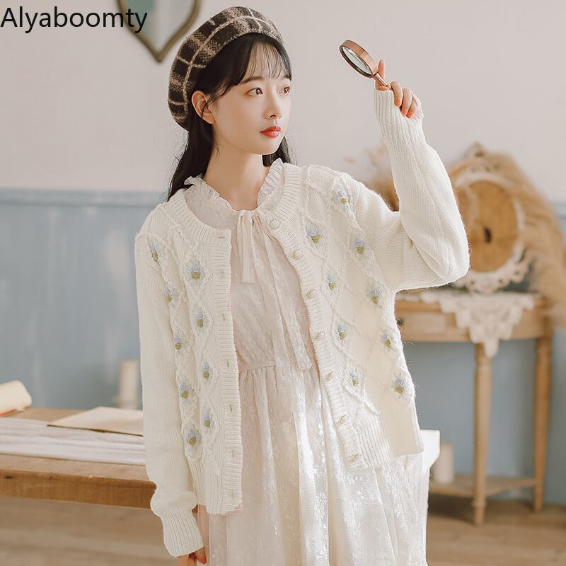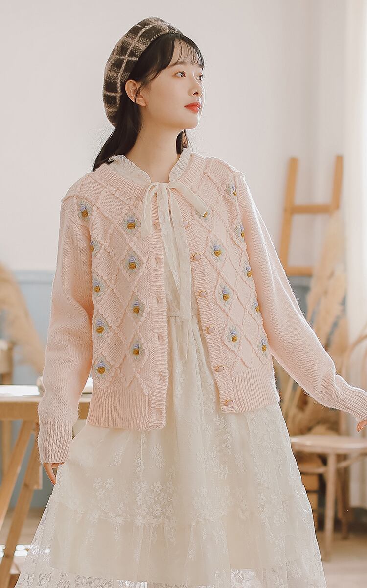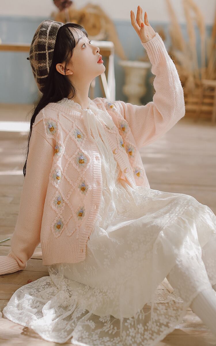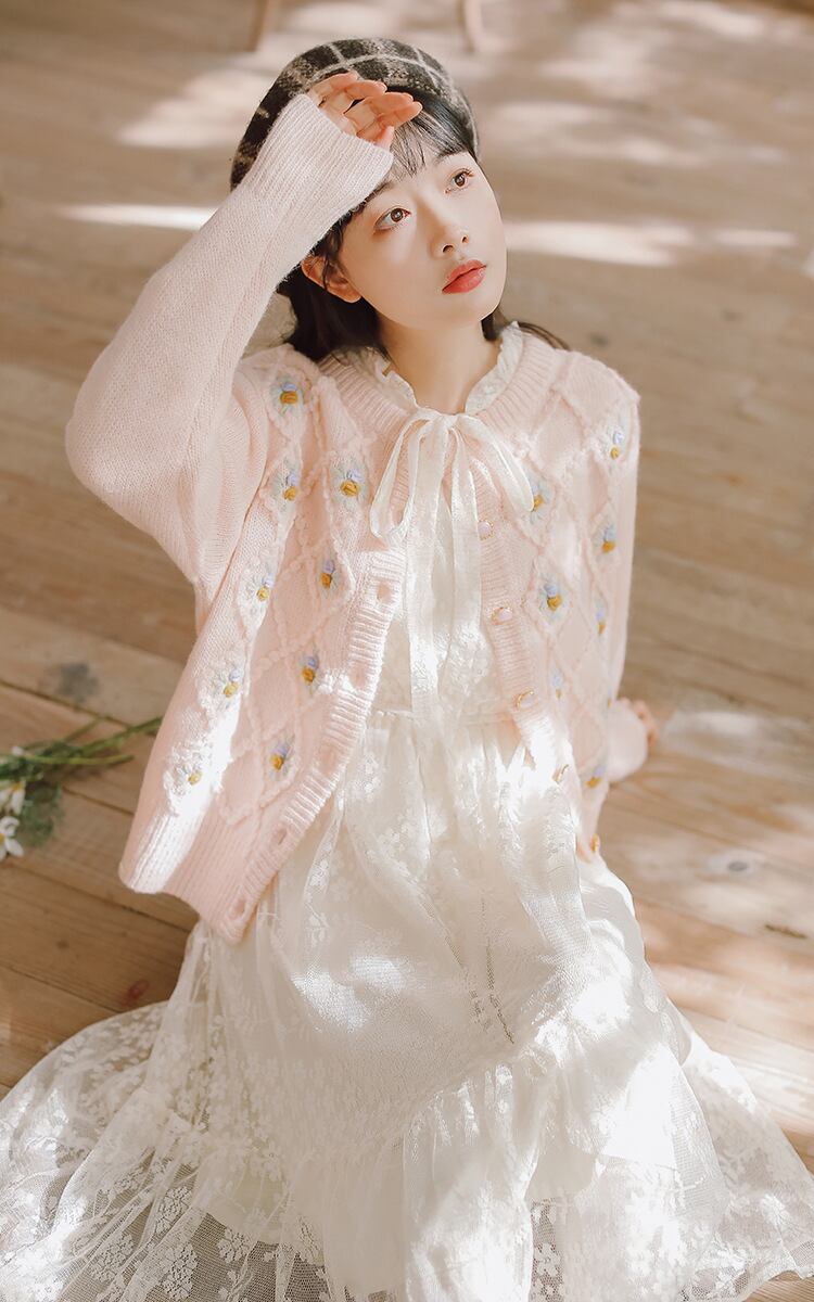 送料無料୨♥୧ ese森スプリング秋レディースカーディガンホワイトピンクフローラル刺繍繊細ニットアウター可愛い甘いセーター AOS26983651073