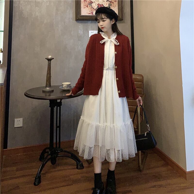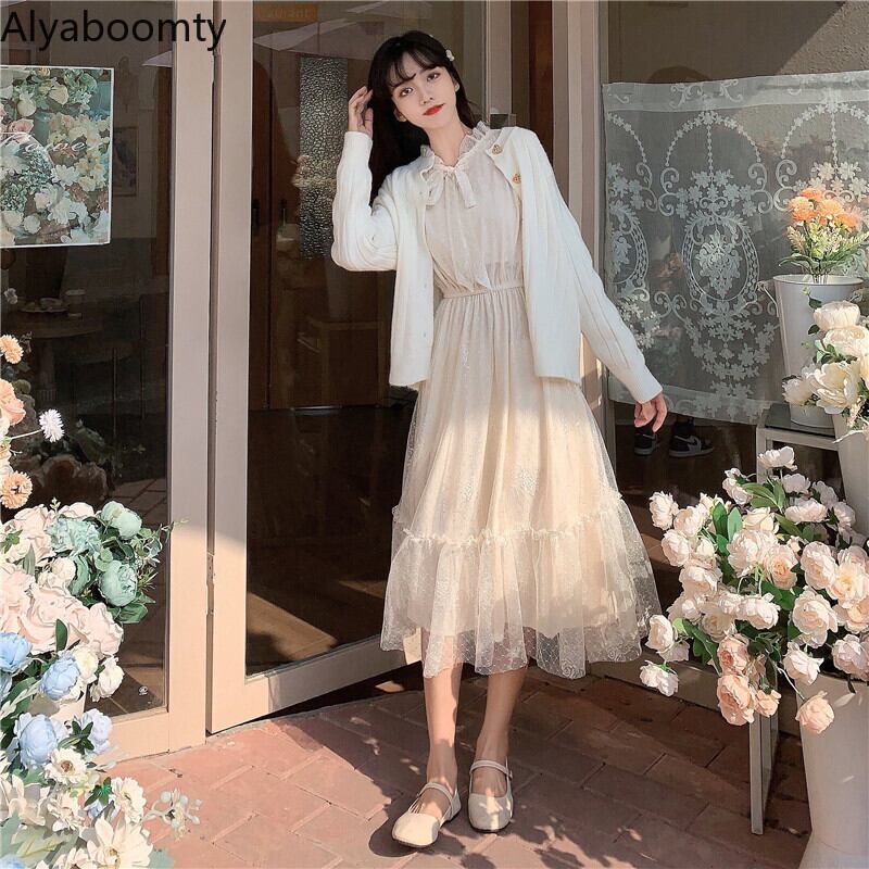 送料無料୨♥୧ プレッピースタイルスプリングオータムレディースミディ甘いドレス リボンカラーホワイトアプリコットフローラルレース可愛いフリル AOS37937305857