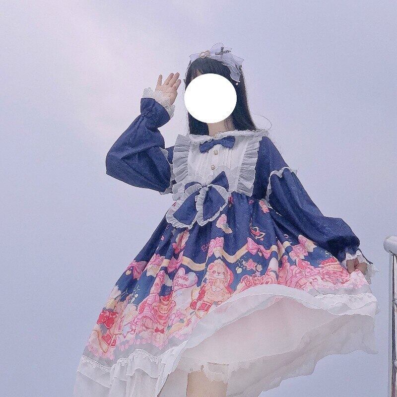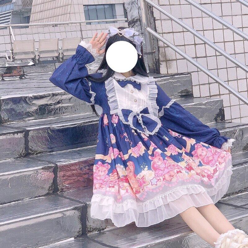 送料無料୨♥୧ スプリングオータムレディースロリータスタイルドレス ピーターパンカラーピンクブルーレッドリボン漫画パターン可愛いパーティー AOS31516499962