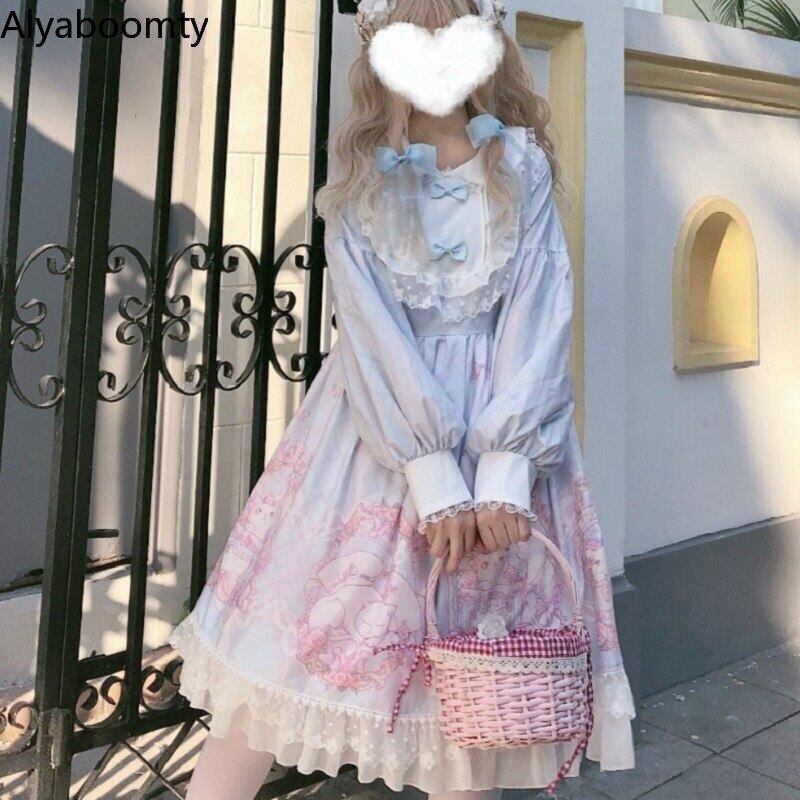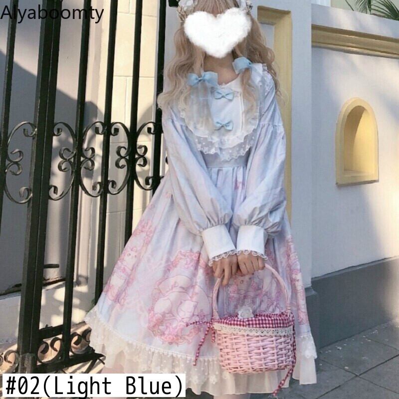 送料無料୨♥୧ eseロリータスタイルレディースパーティードレス アプリコットピンク紫のブルー動物プリント柄リボンレースフリルランタンスリーブ AOS40592727976