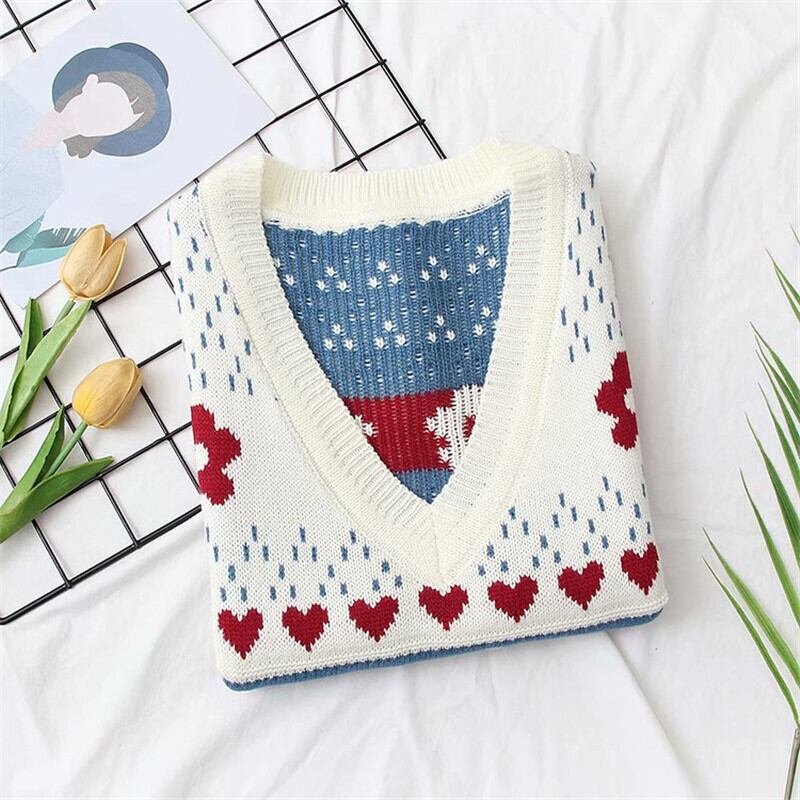 送料無料୨♥୧ レディースオータムウィンターセーター ハートパターンVネックニットスタイル 大人ガーリー スウィート キュート カジュアル かわいい 秋物 冬物 AOS83654748918
