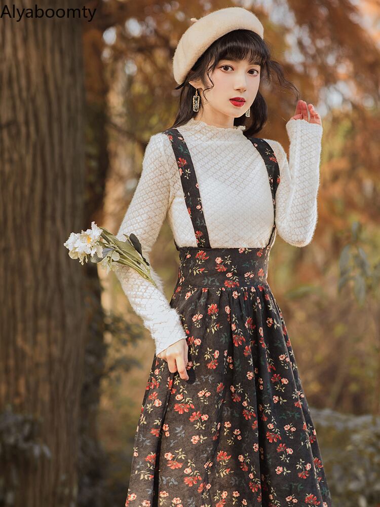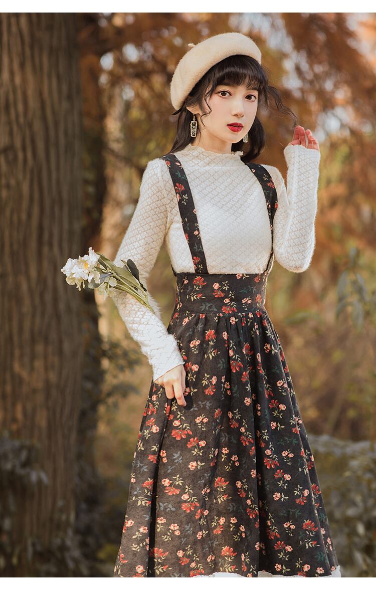 送料無料୨♥୧ オータムレディースセット ロングレースフローラルコーデュロイフリルスカート ラッフル 大人ガーリー スウィート キュート カジュアル 秋物 花柄 AOS60484694049