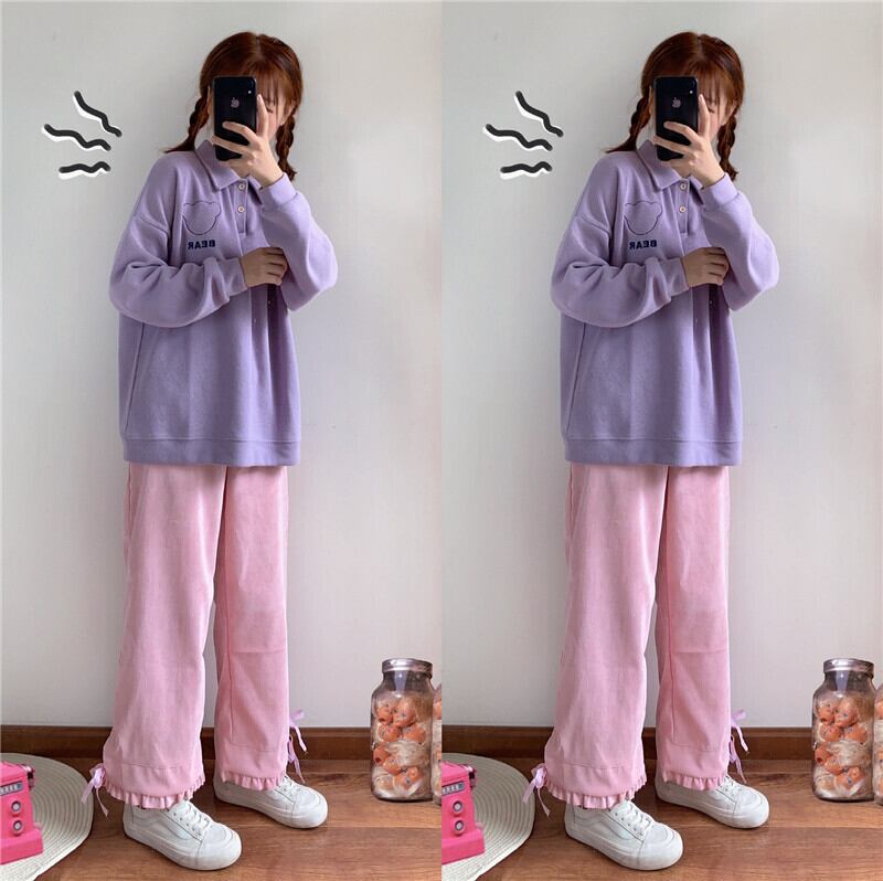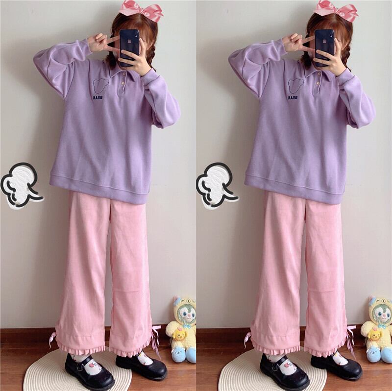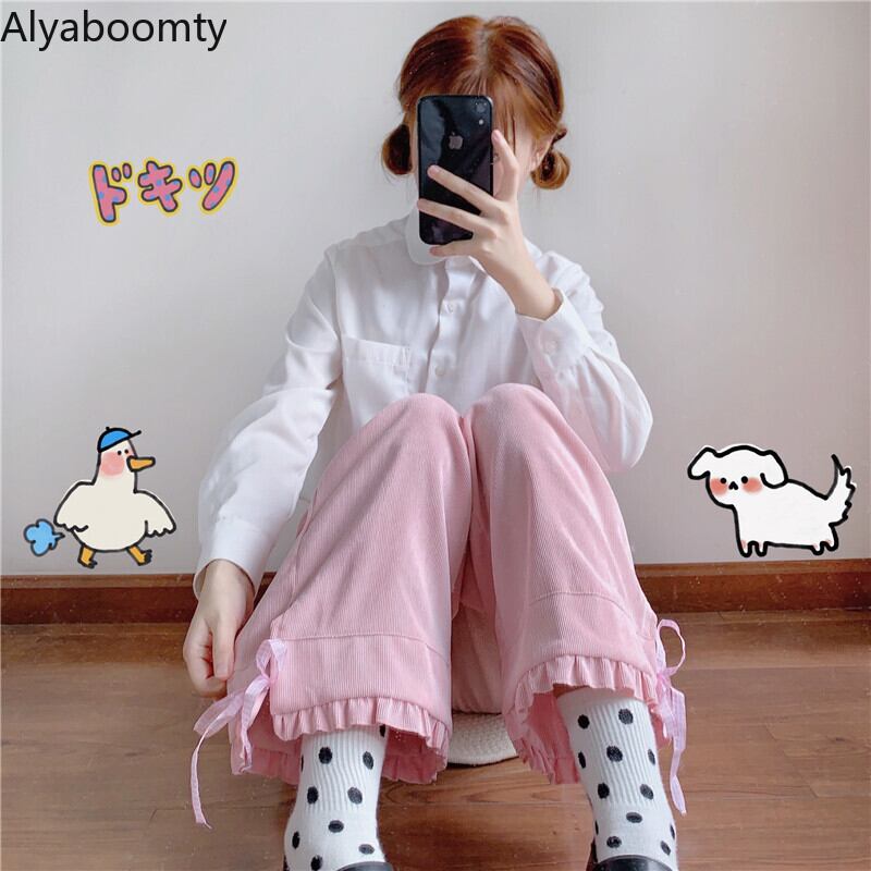 送料無料୨♥୧ スプリングオータムレディースワイドレッグパンツ ウェストコーデュロイリボンフリルルーズ ピンク ラッフル 大人ガーリー スウィート キュート カジュアル 春物 秋物 ワイドパンツ AOS77957582283