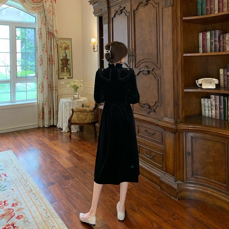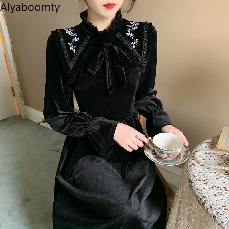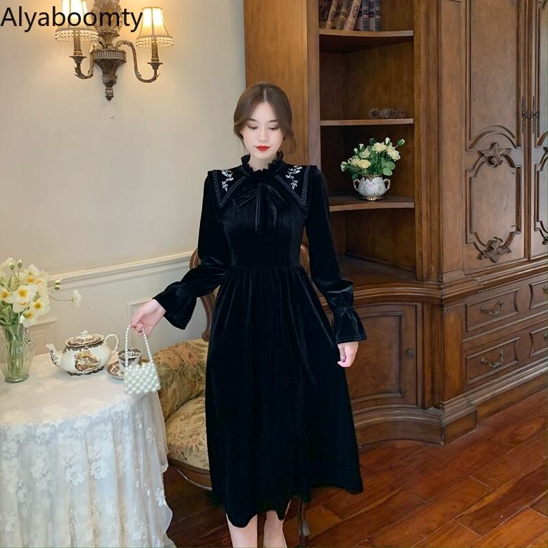 送料無料୨♥୧ オータムウィンターレディースブラックミディドレス カラーフローラル刺繍リボンヴィンテージベルベット 秋物 冬物 花柄 ビンテージ AOS29033539510